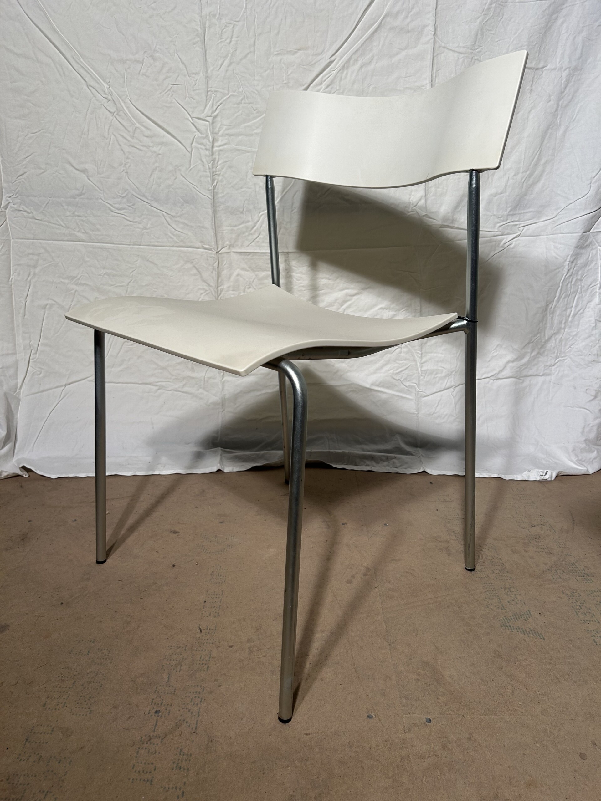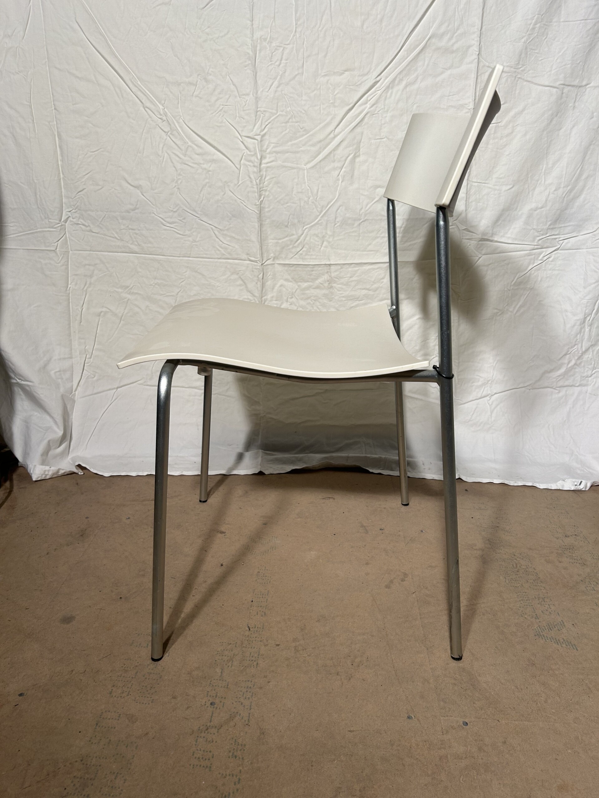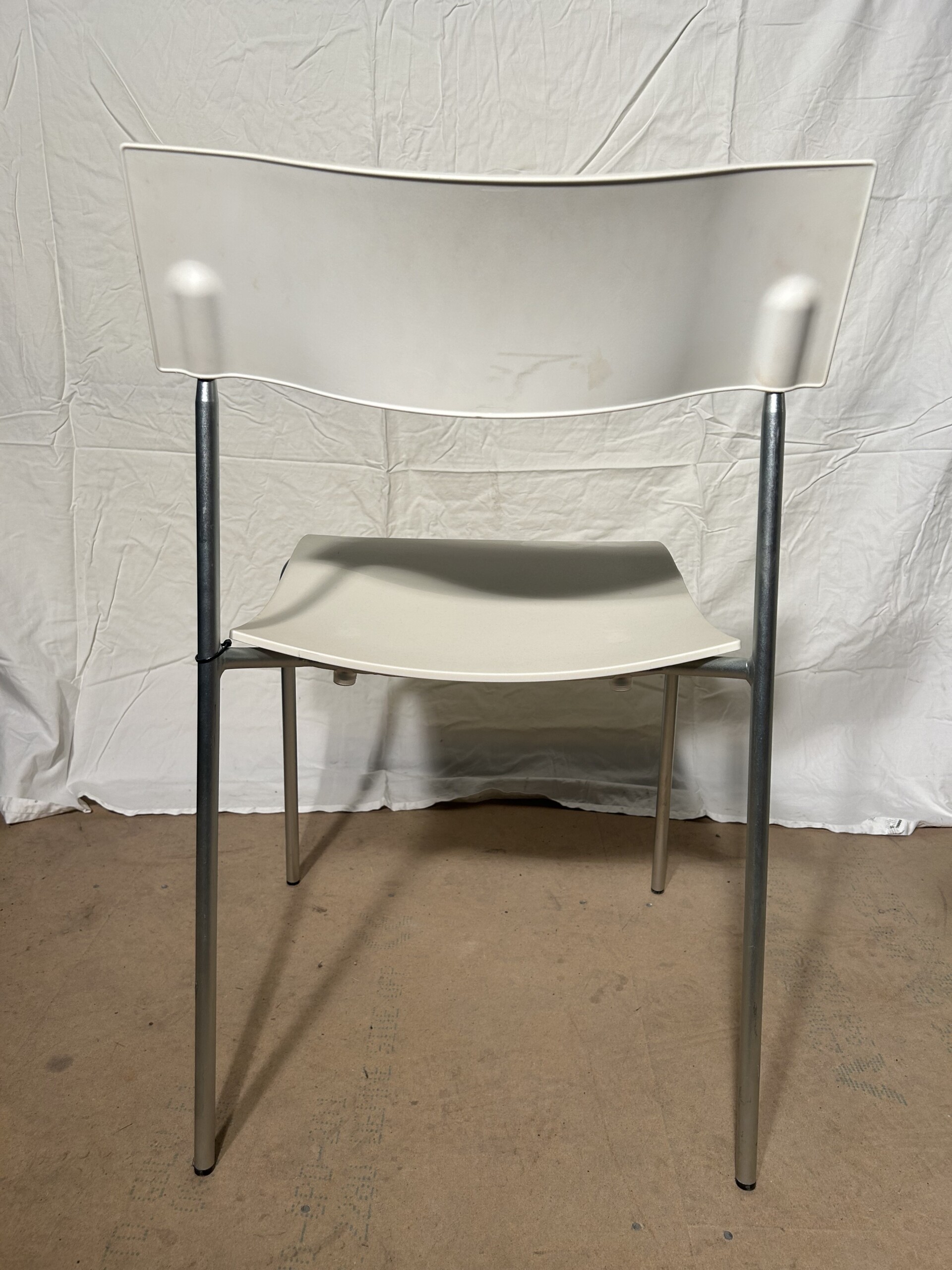 Sits och rygg i plast (vit). Ben i metall (krom).