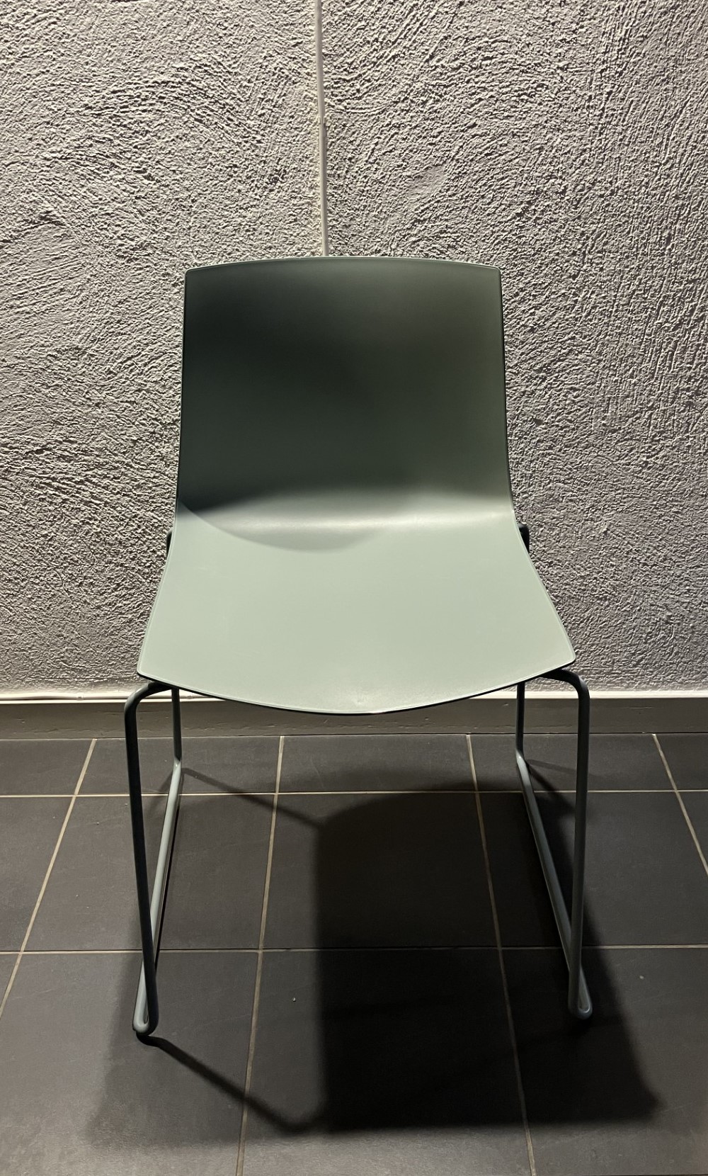 Sits och rygg i plast (blå). Medstativ i metall (blå).