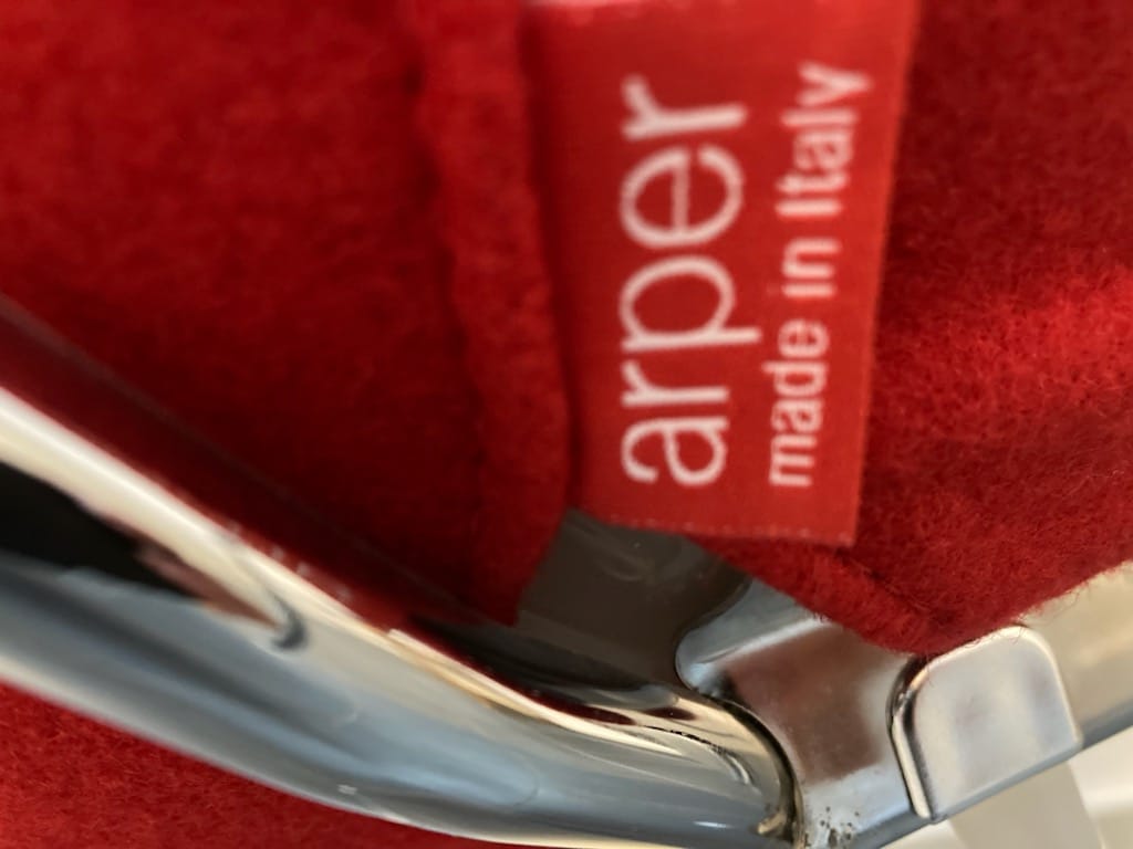 Sits och rygg i tyg (röd). Ben i metall (aluminium).