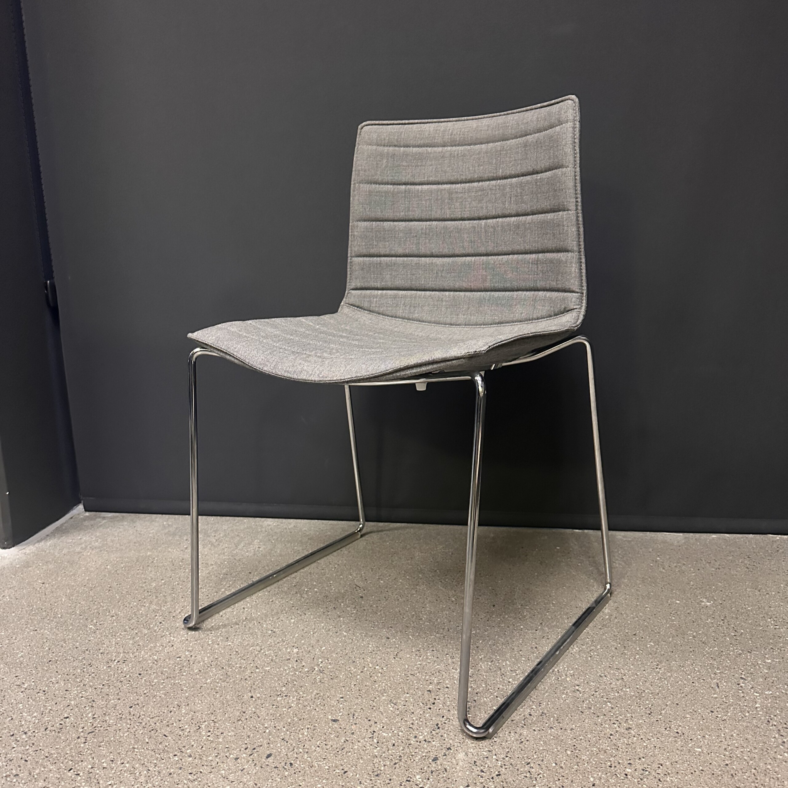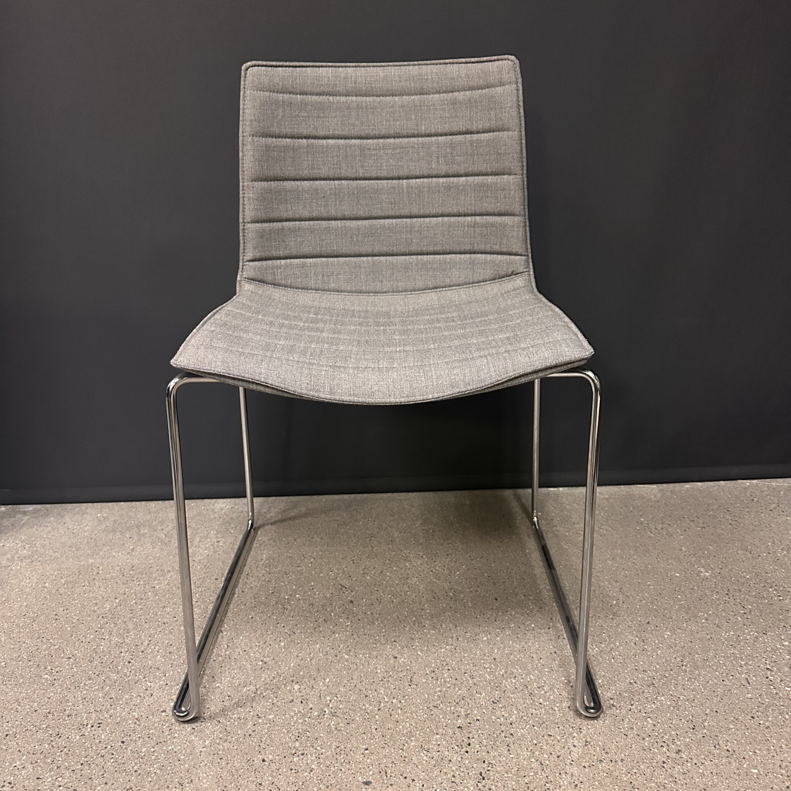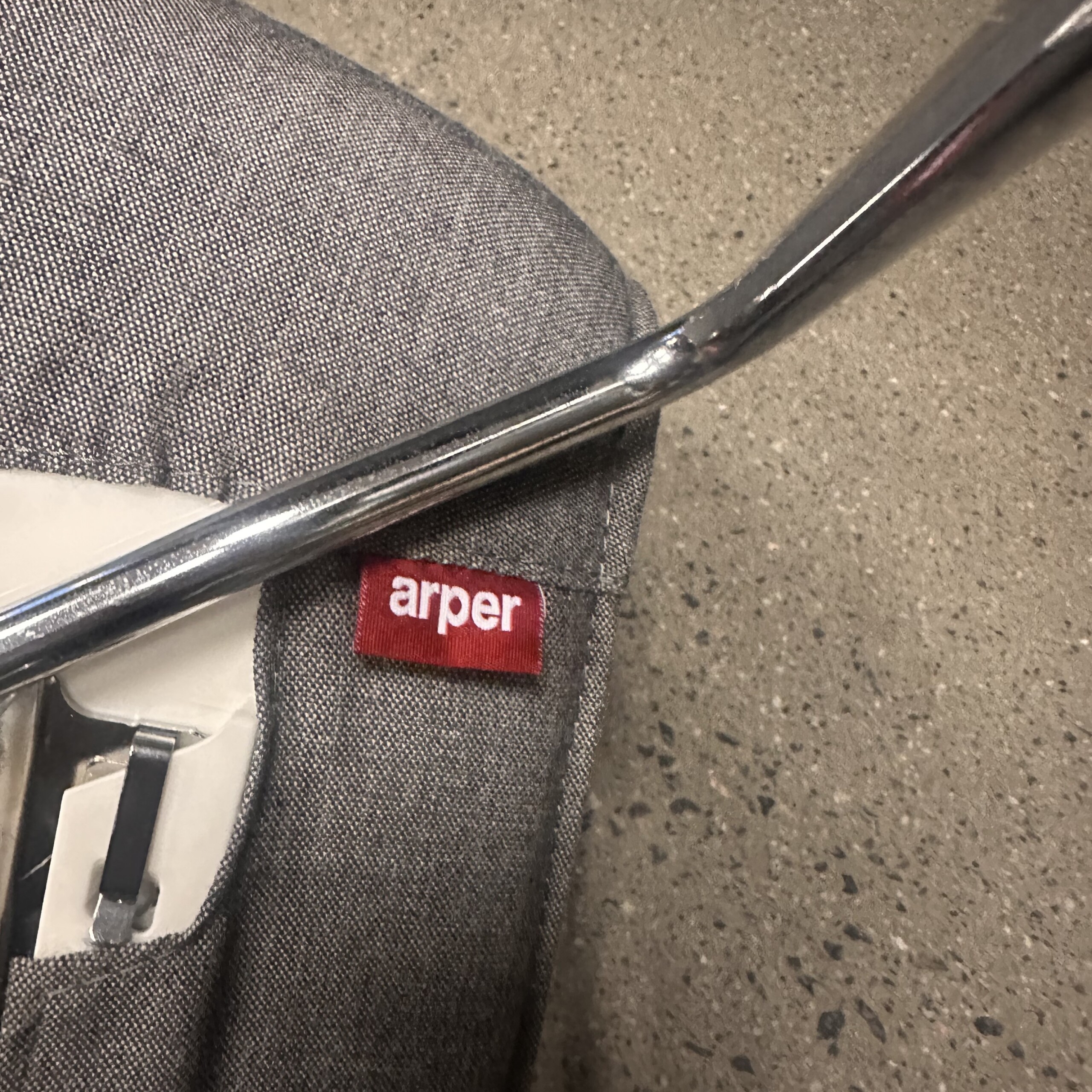 Sits och rygg i tyg (grå). Medstativ i metall (silver).