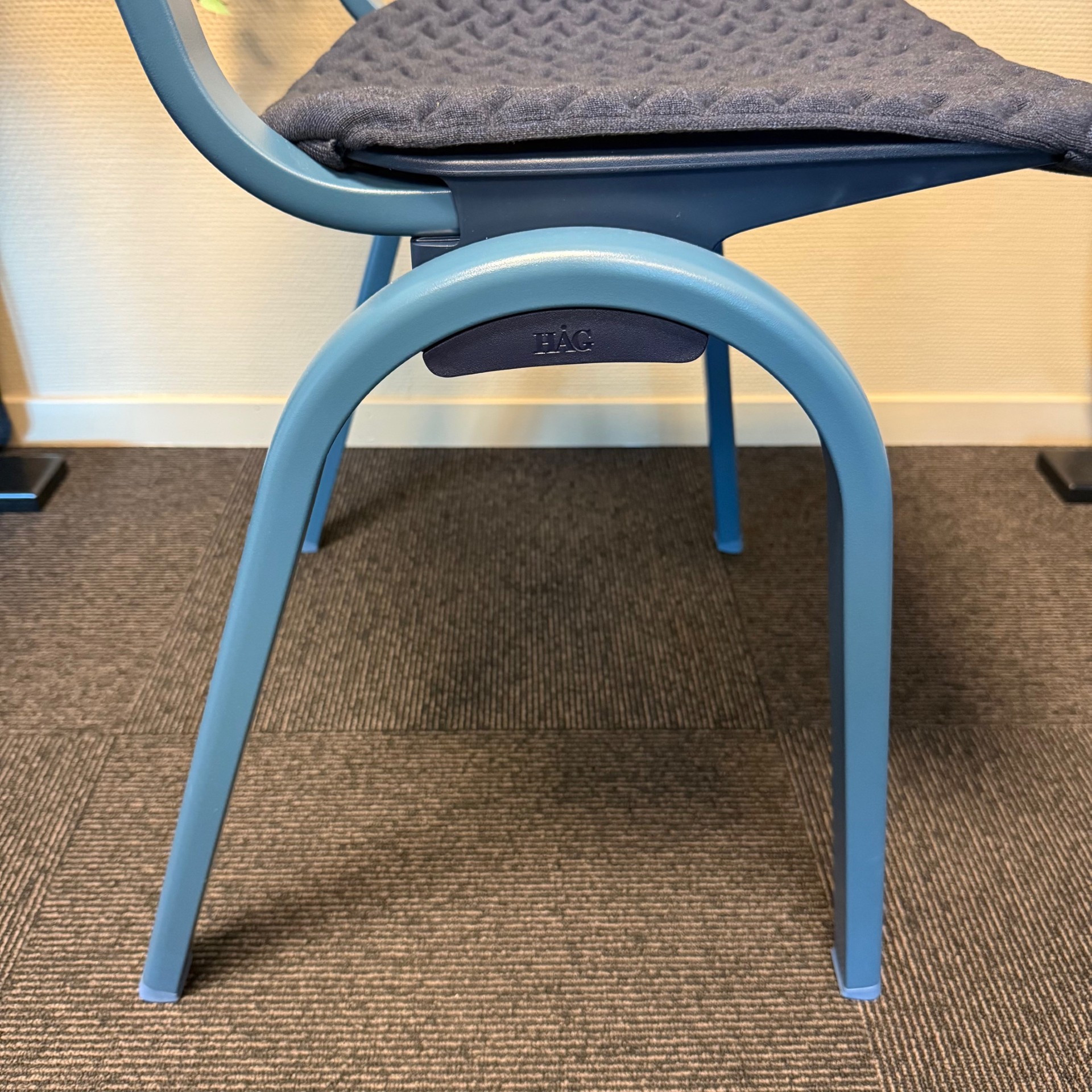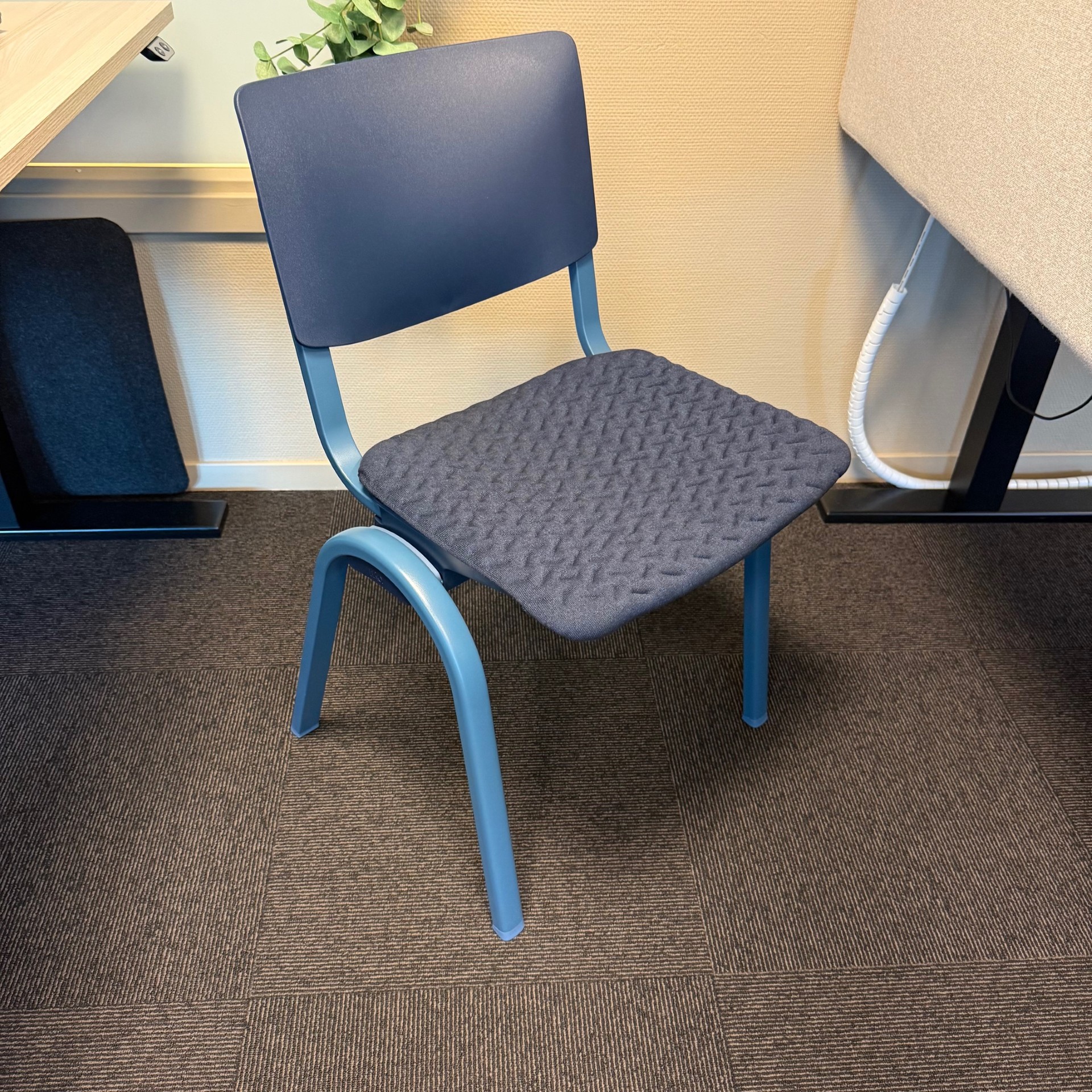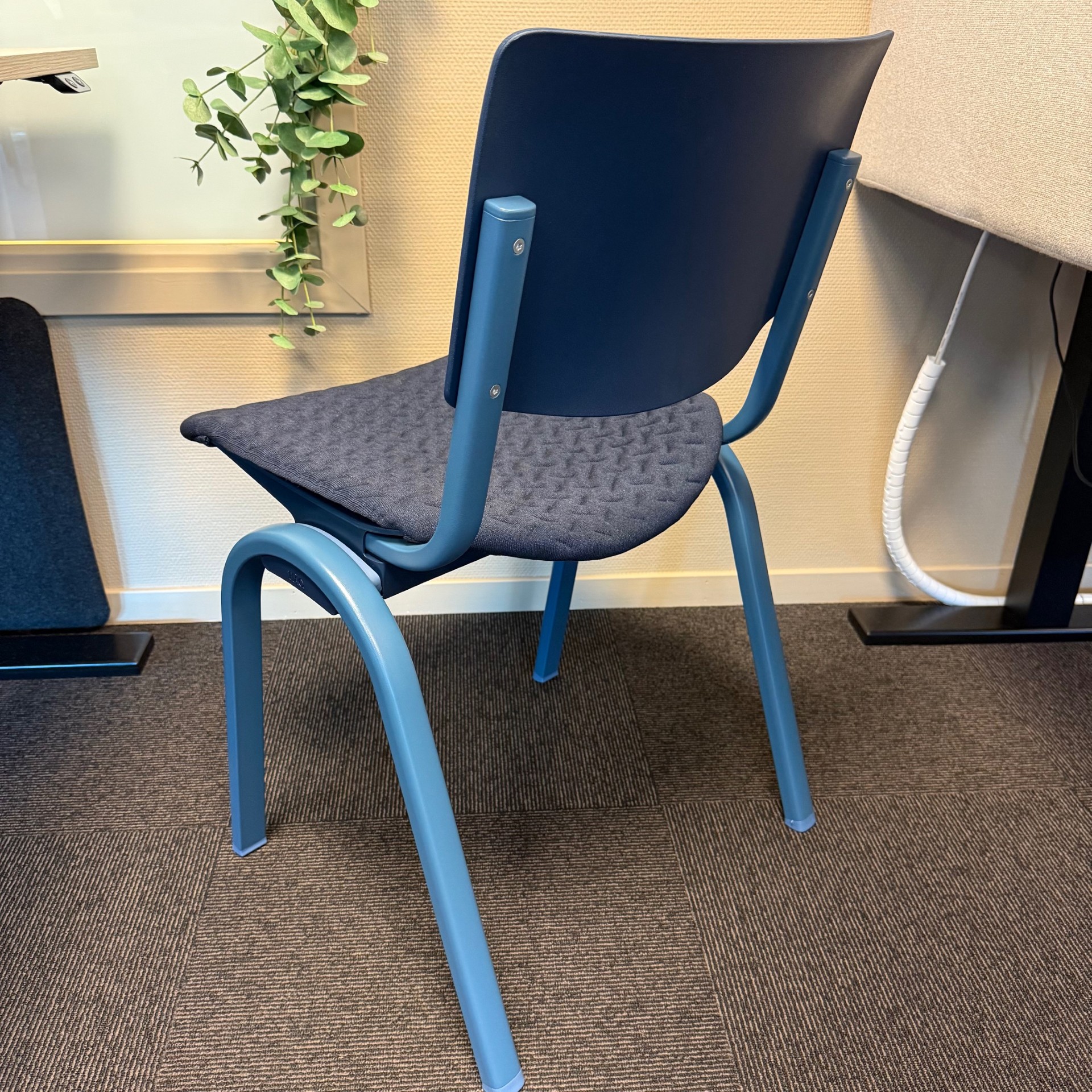 Sits och rygg i plast (blå). Ben i metall (blå).