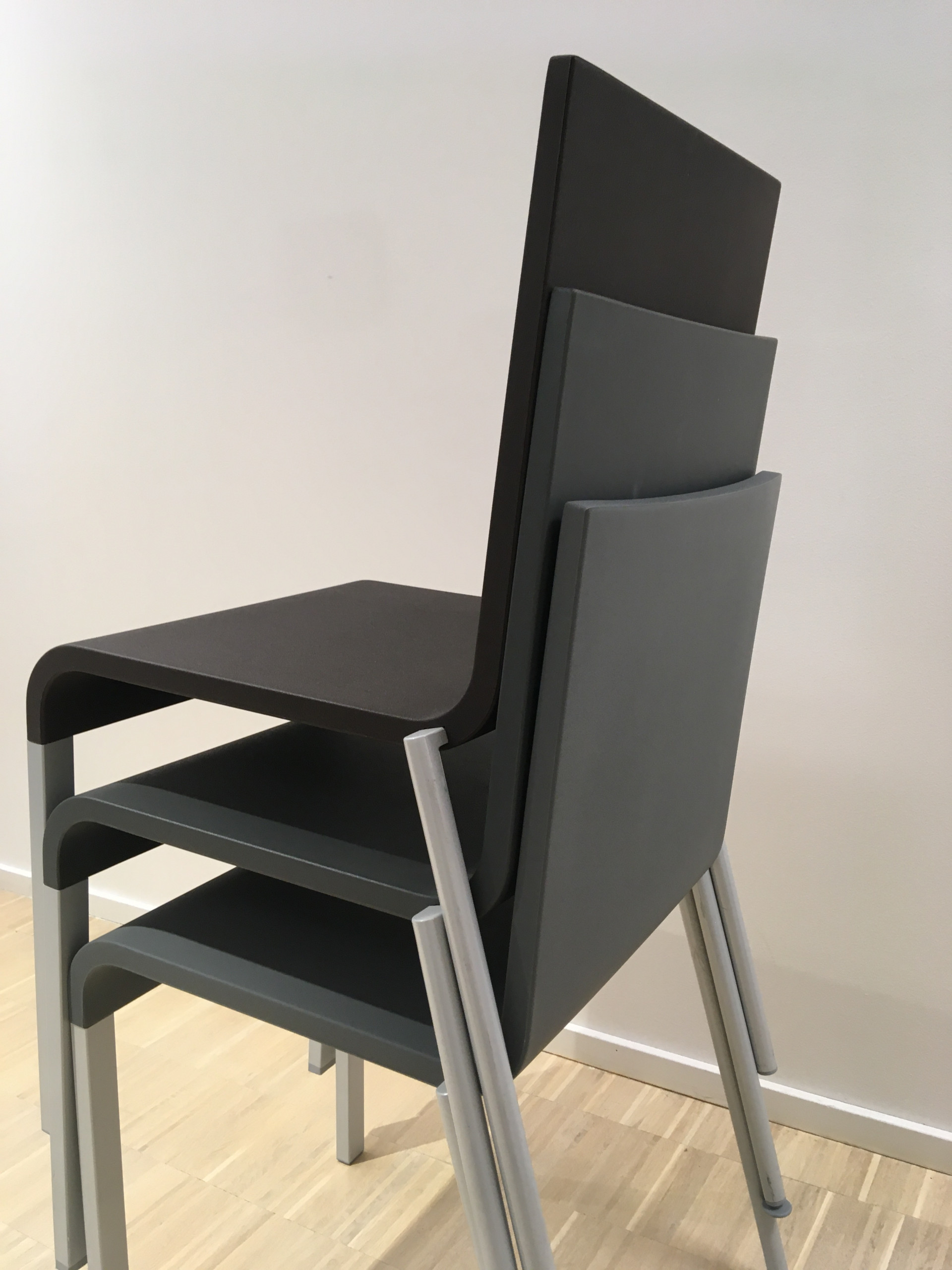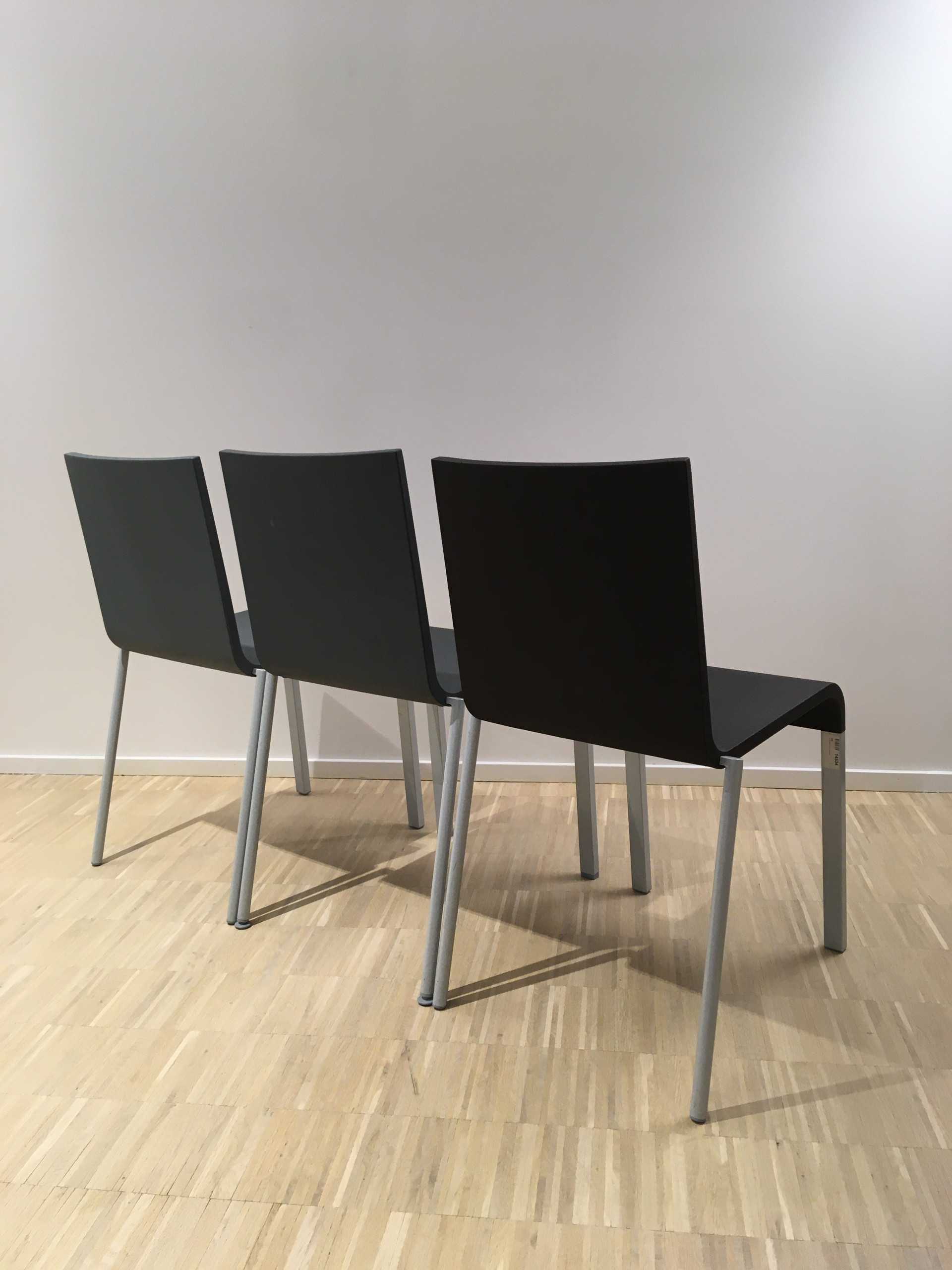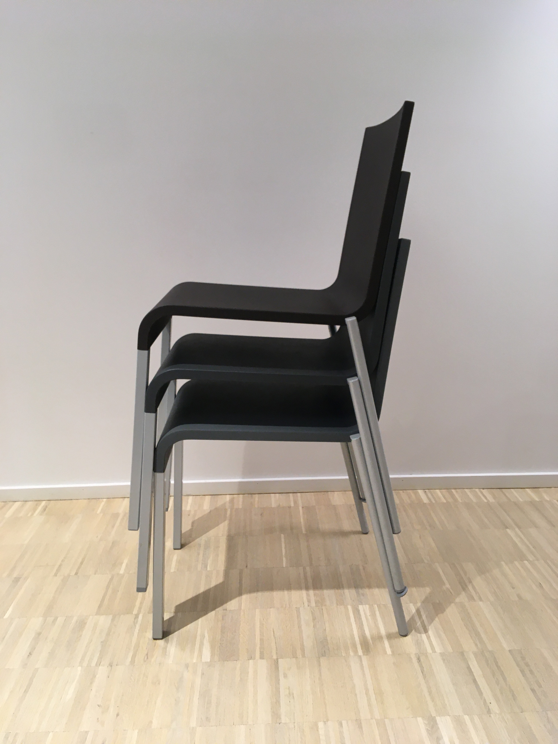 Sits och rygg i gummi (svart). Ben i metall (silver).
