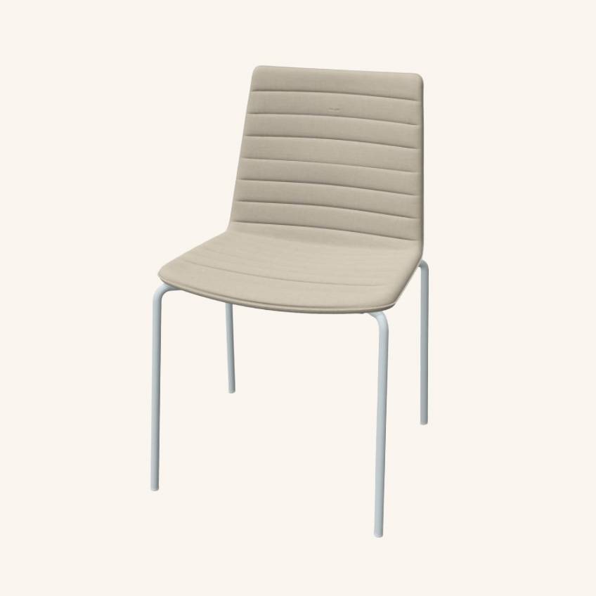 Sits och rygg i tyg (beige). Ben i metall (rostfritt).