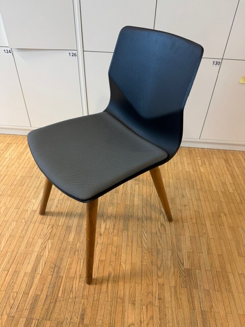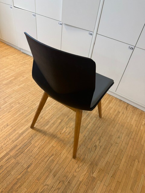 Sits i tyg (grå). Rygg i plast (svart). Ben i trä (ek).