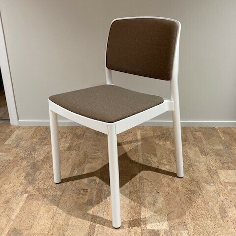 Sits och rygg i tyg (brun). Ben i trä (vit).