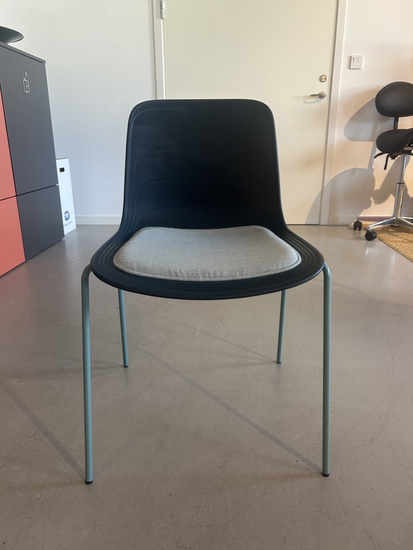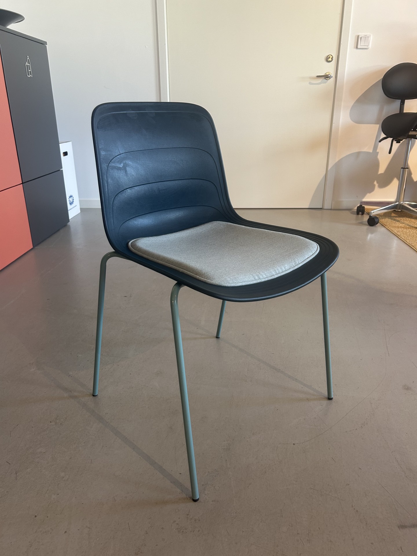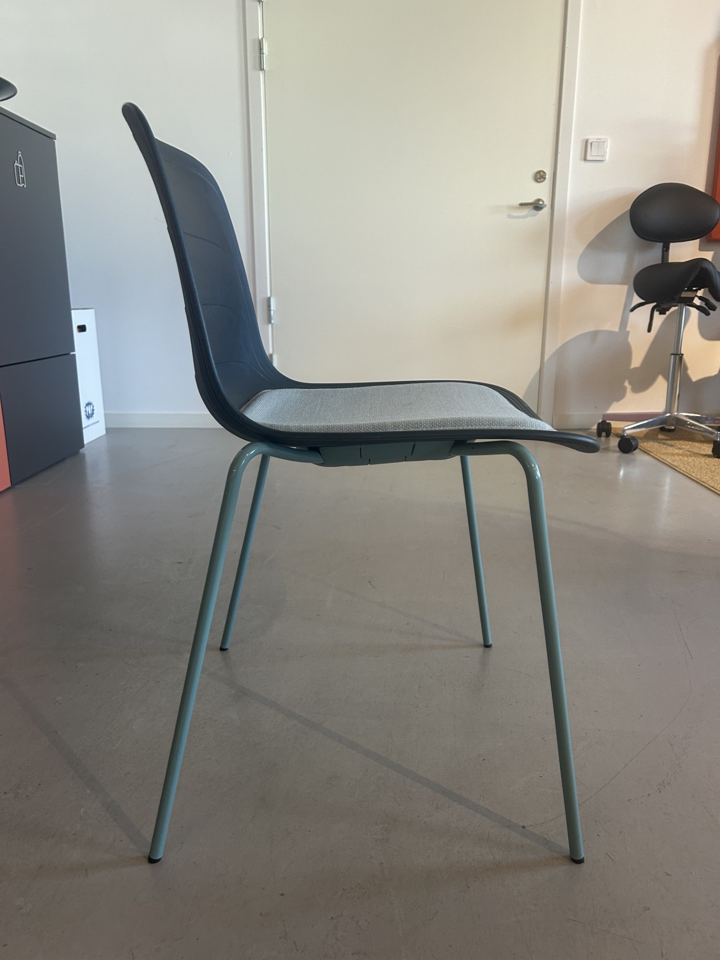 Sits i tyg (turkos). Rygg i plast (blå). Ben i metall (turkos).