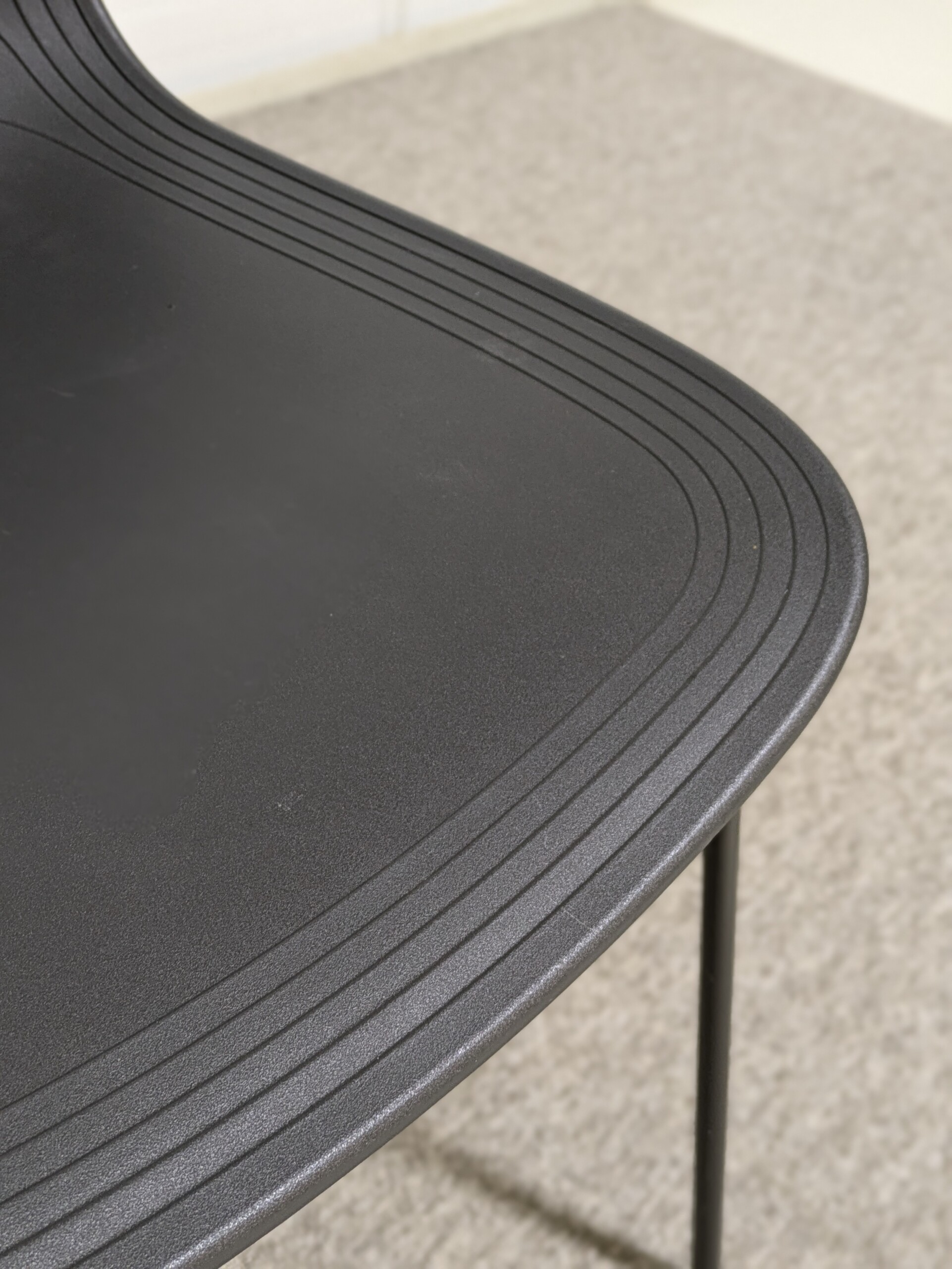 Sits och rygg i plast (grå). Ben i metall (svart).