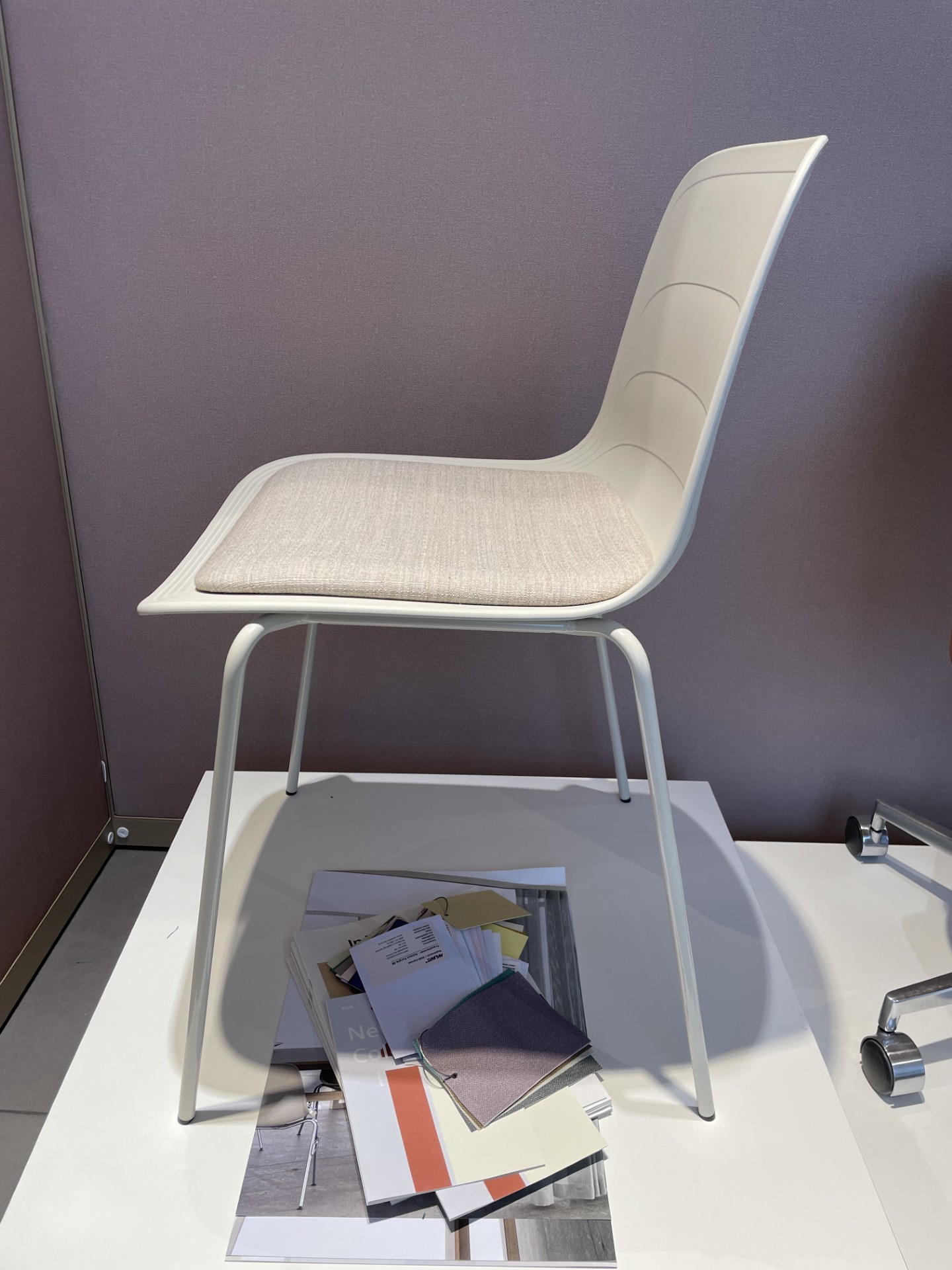 Sits i tyg (beige). Rygg i plast. Ben i metall.