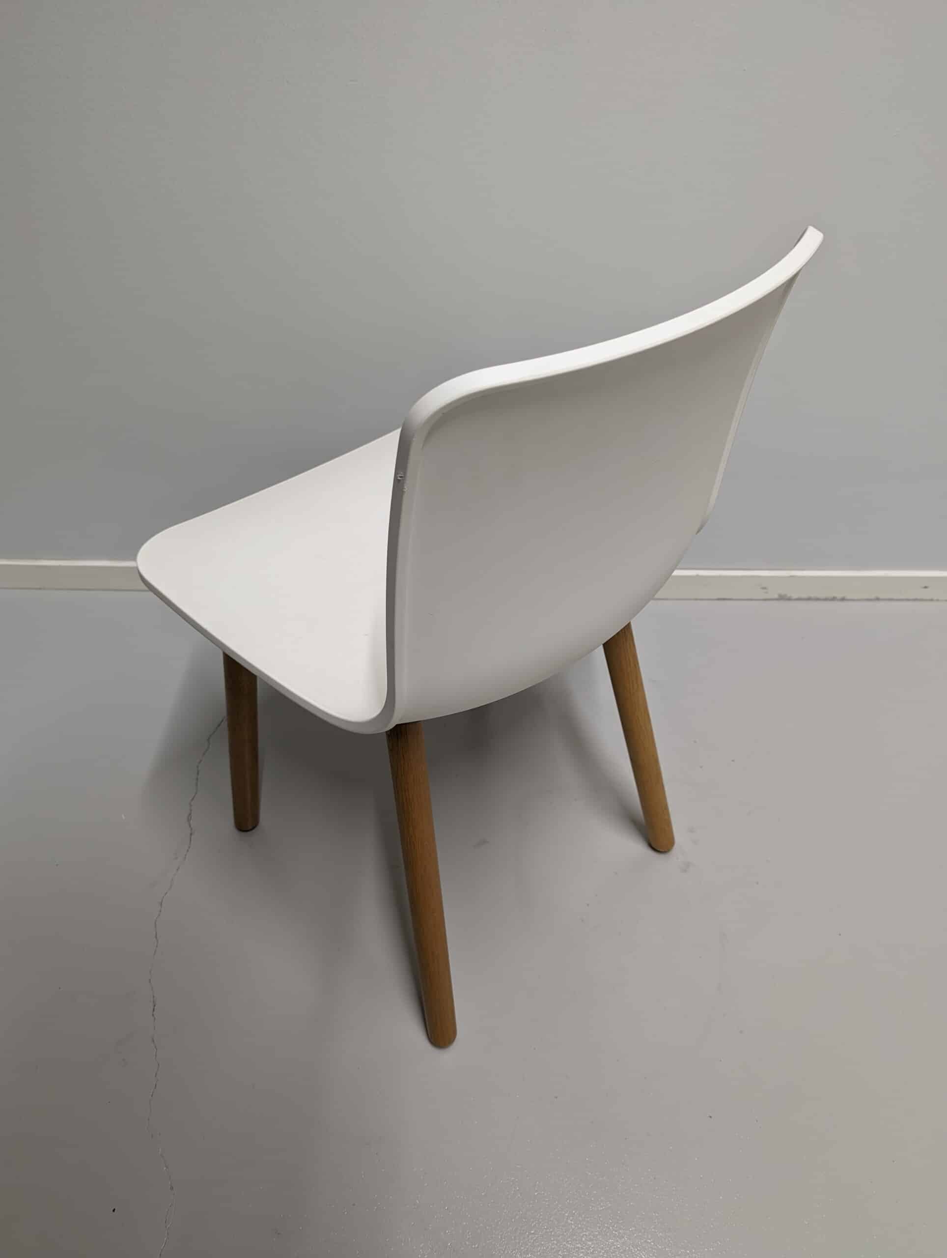 Sits och rygg i plast (vit). Ben i trä (ek).