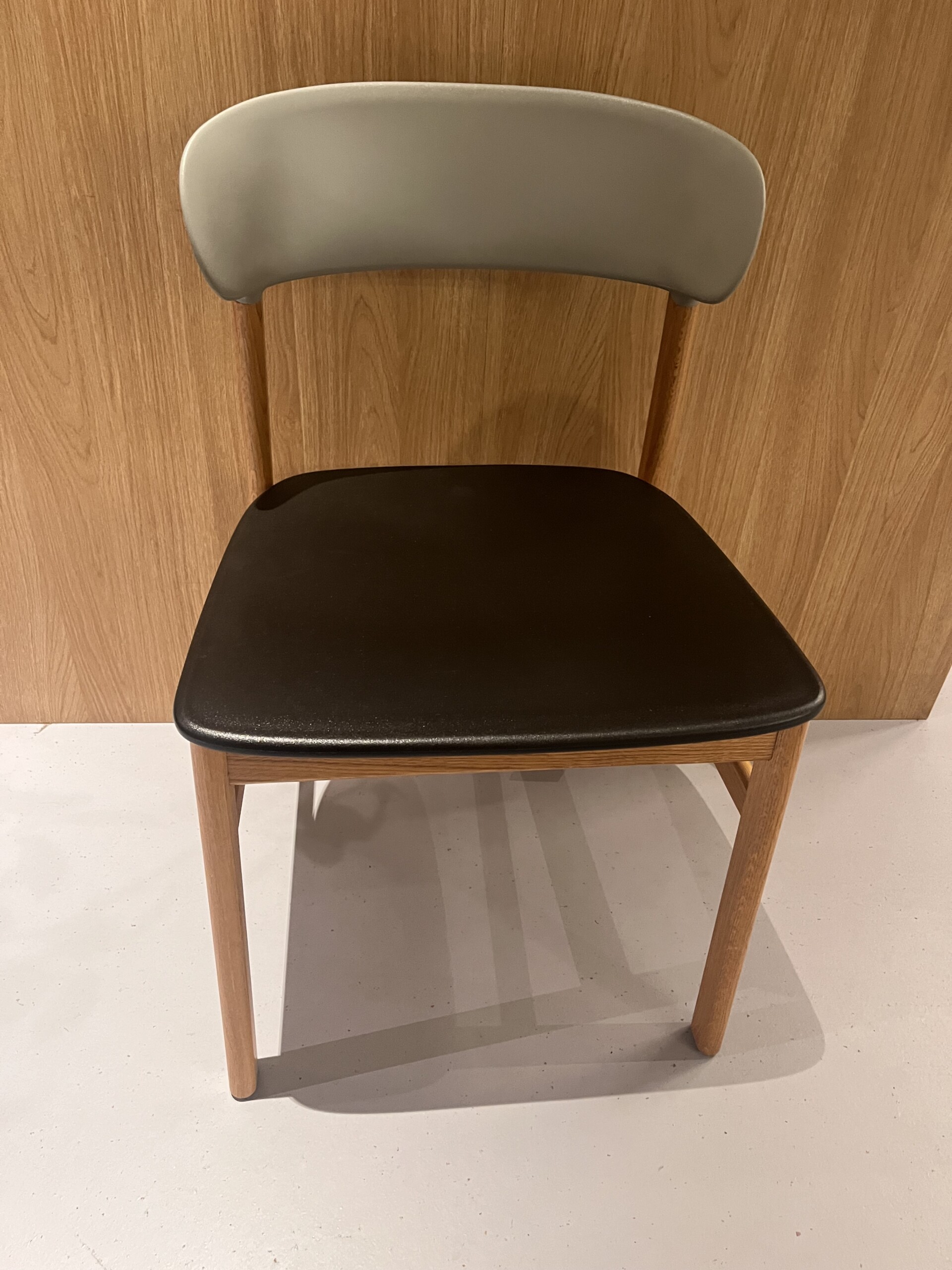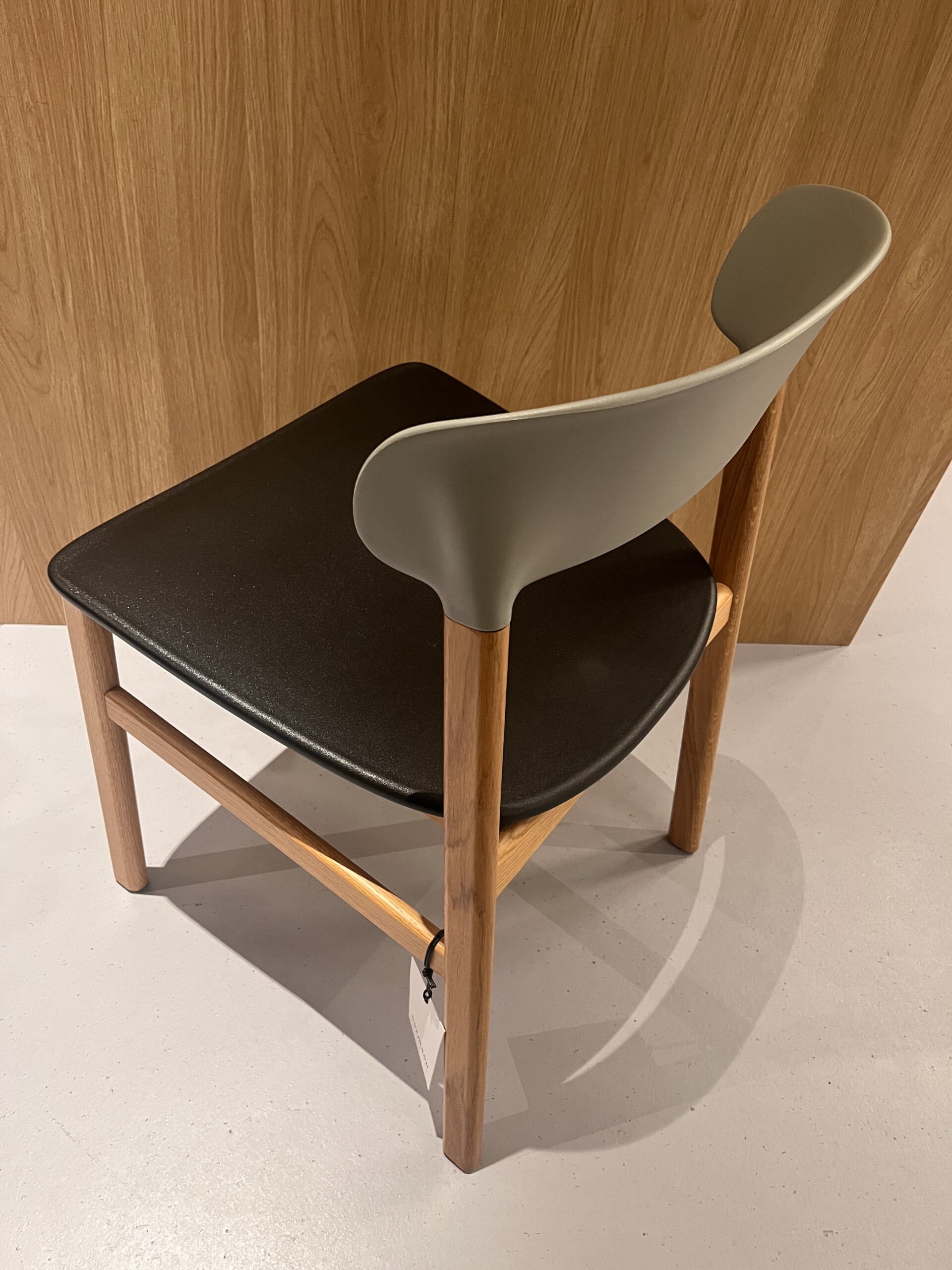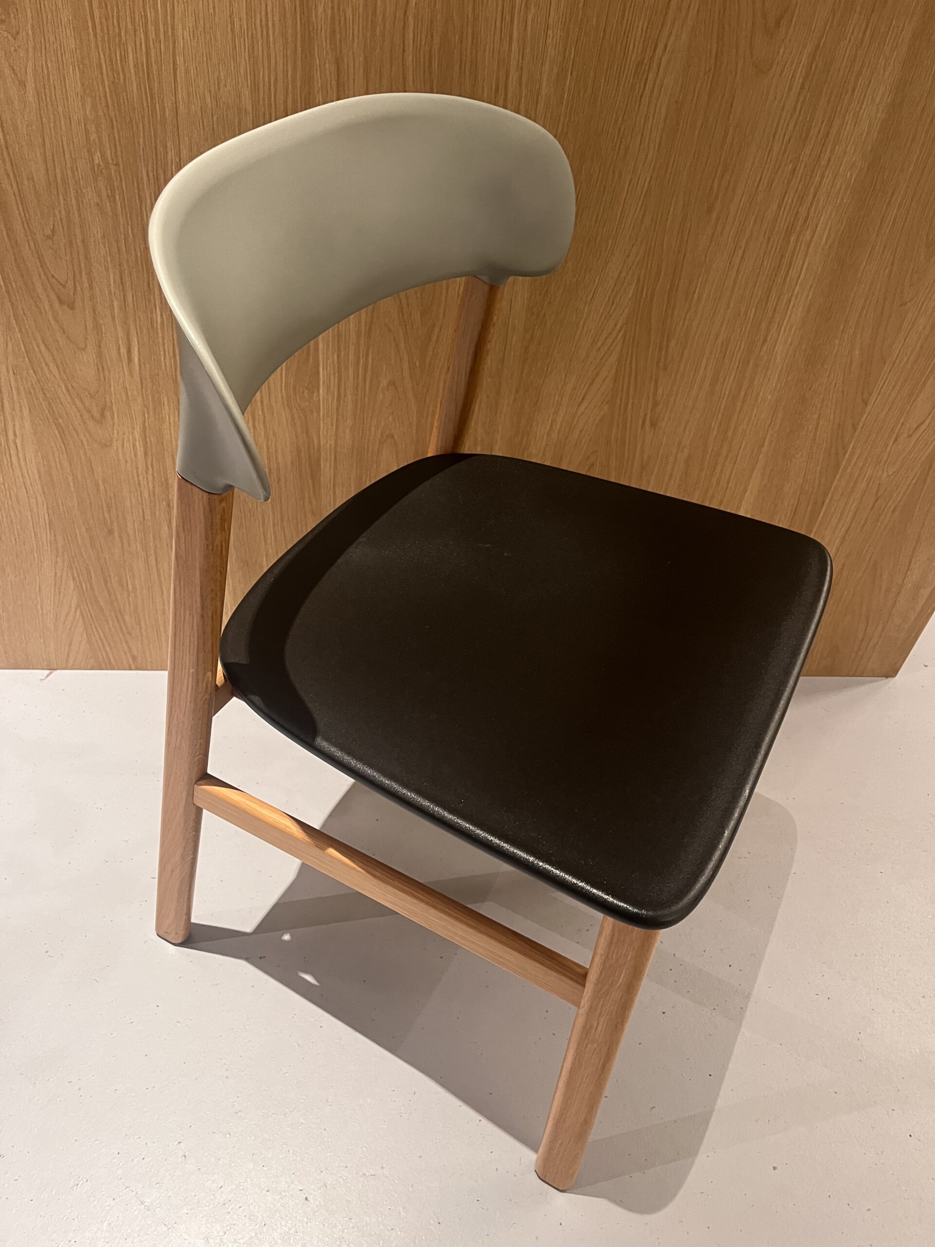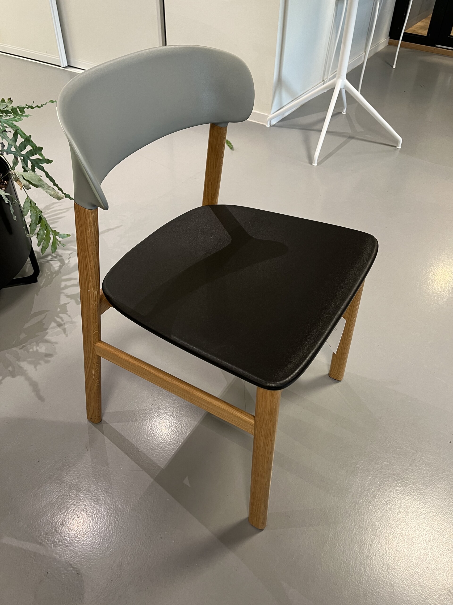 Sits i plast (svart). Rygg i plast (grå). Ben i trä (ek).