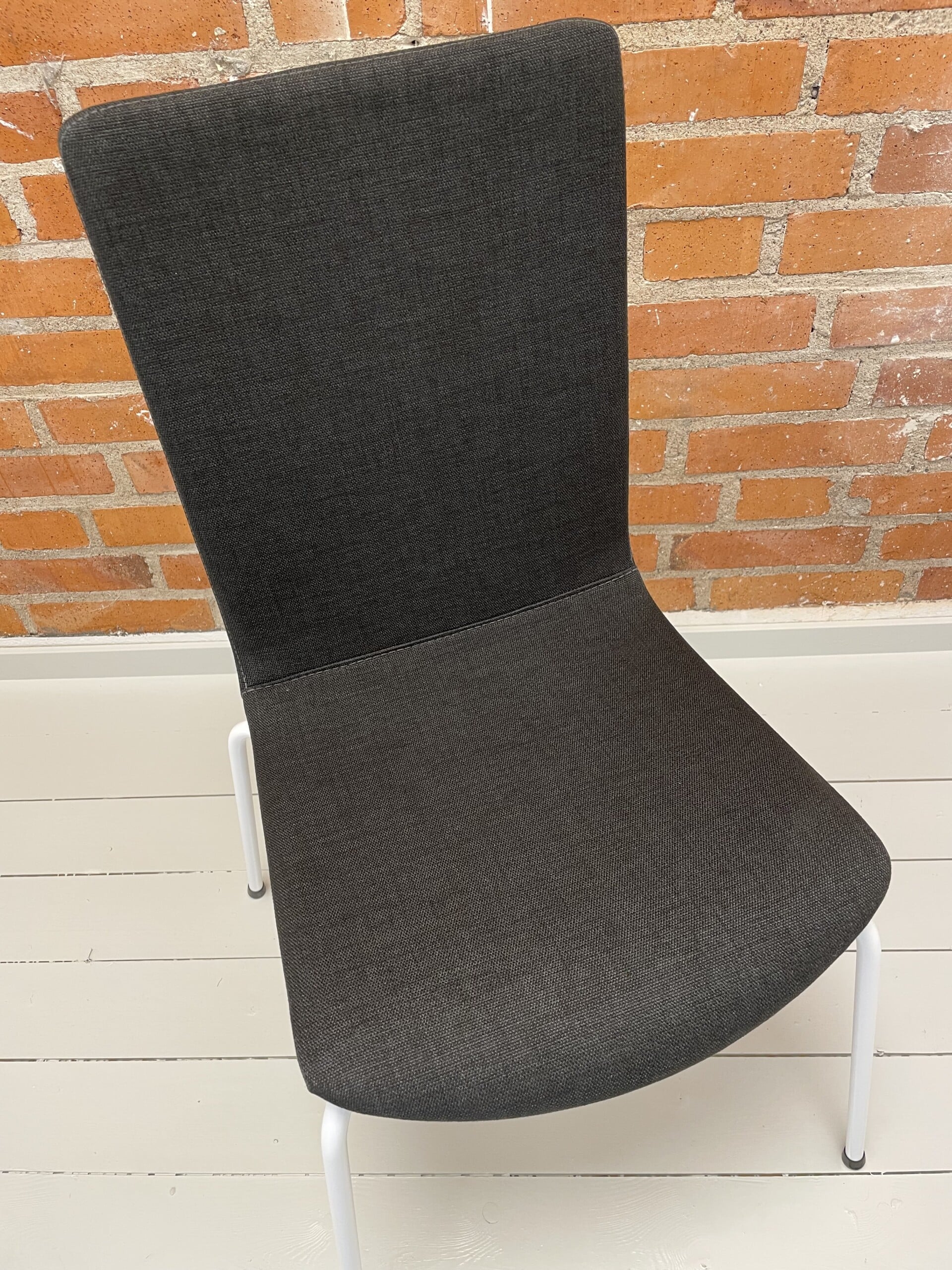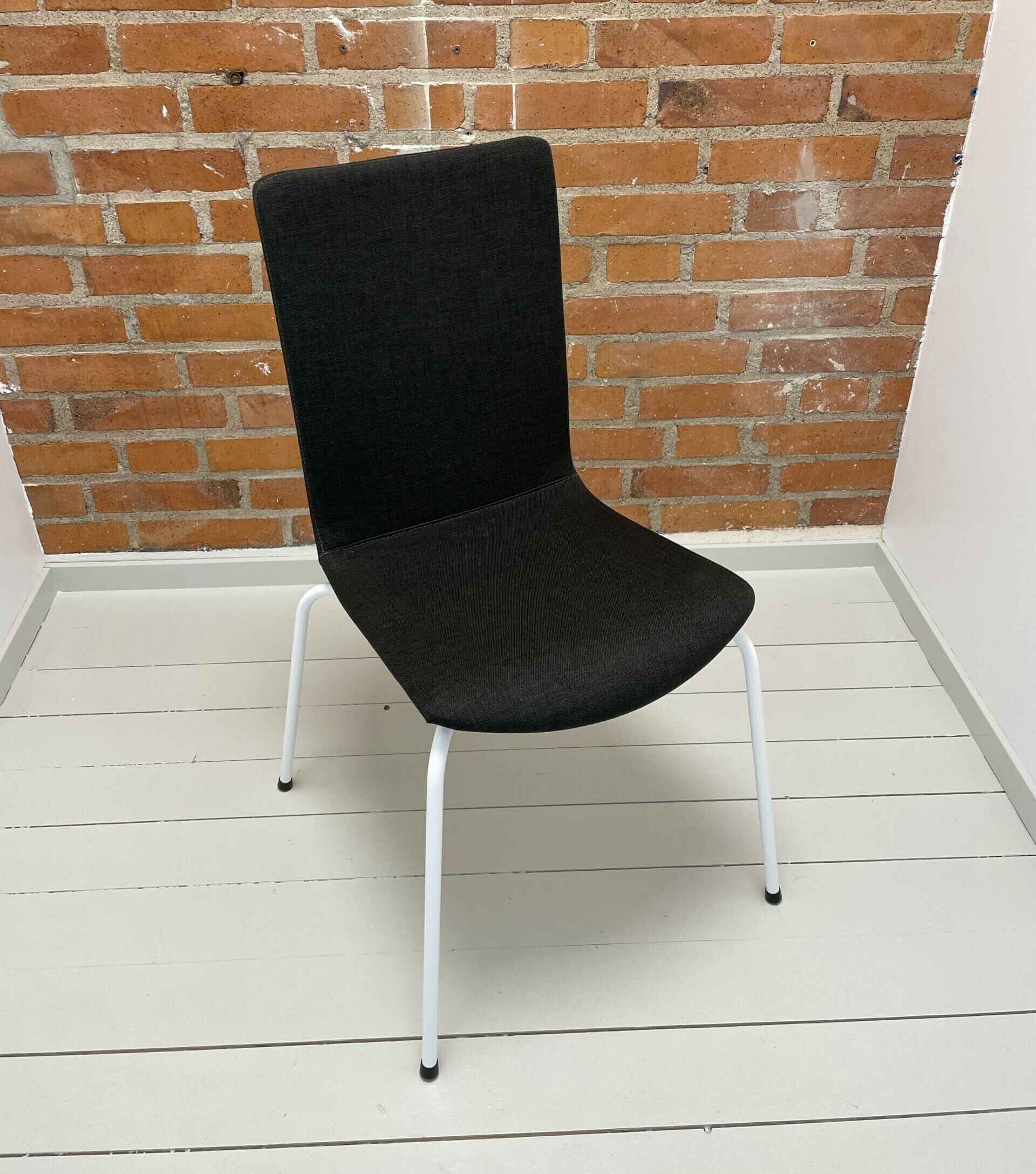 Sits och rygg i tyg (grå). Ben i metall (vit).