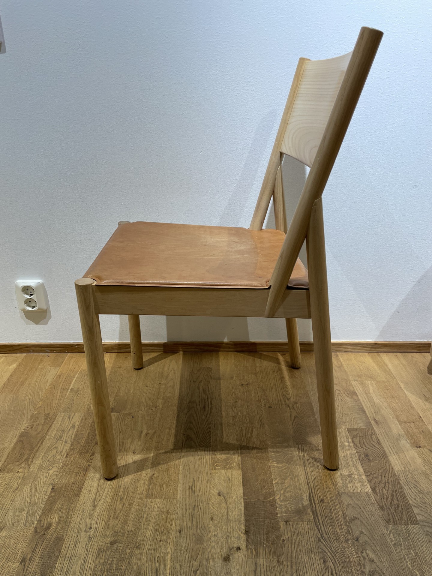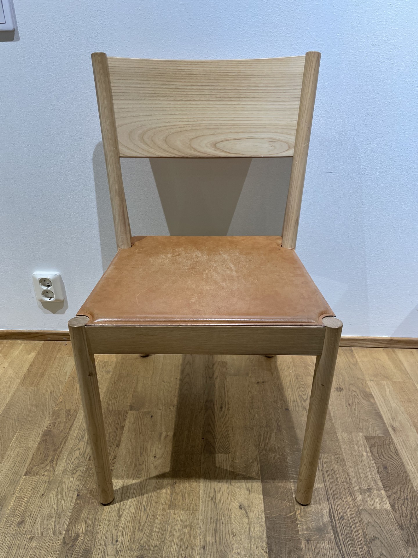 Sits i läder (brun). Rygg i trä (ask). Ben i trä (ask).