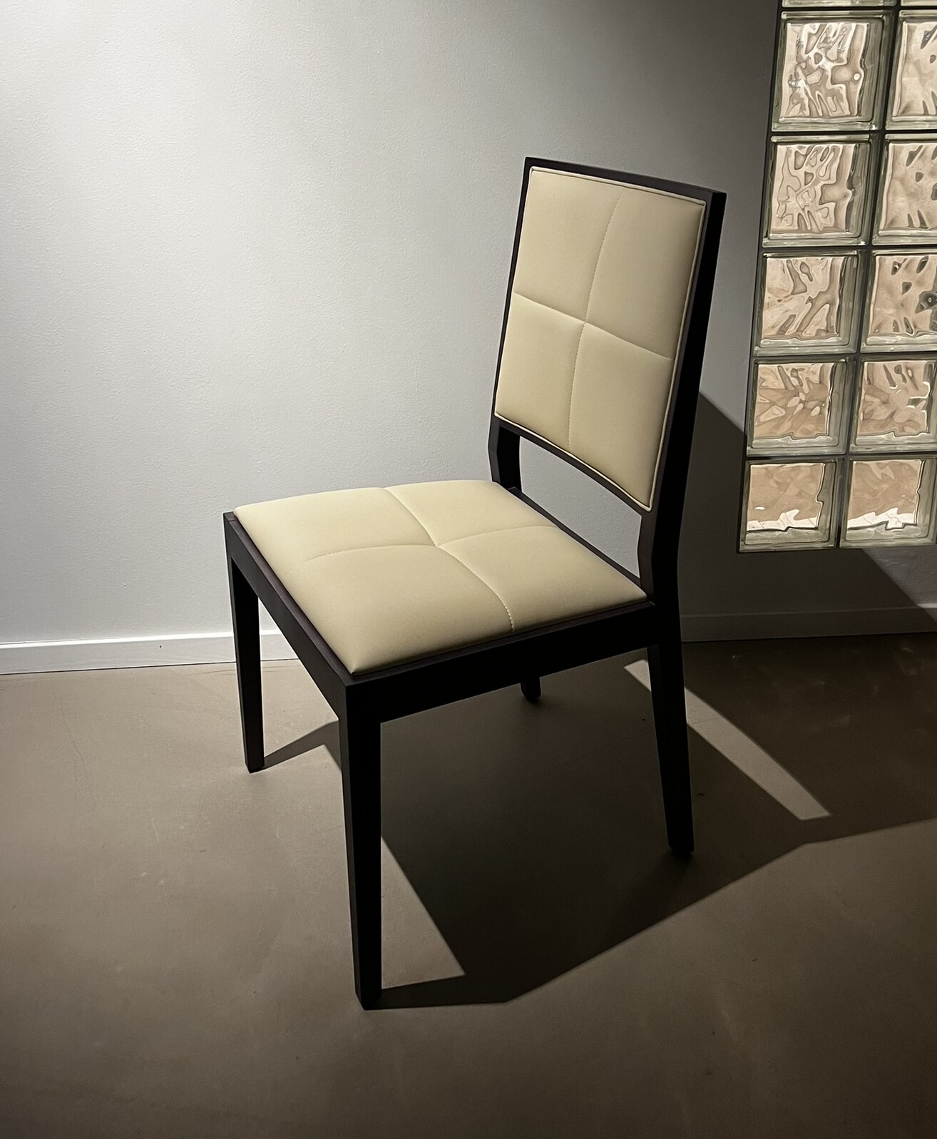 Sits och rygg i läder (vit). Ben i trä (björk).