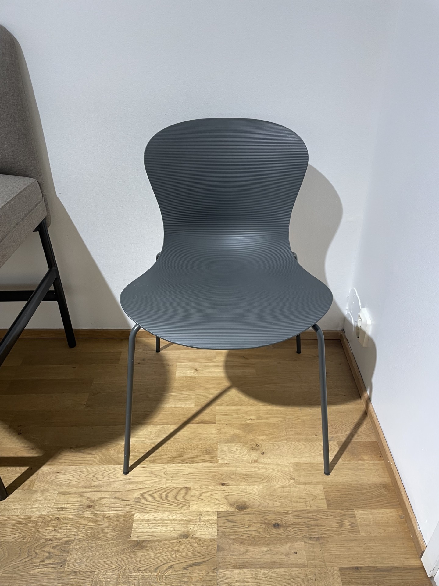 Sits och rygg i plast (grå). Ben i metall (svart).