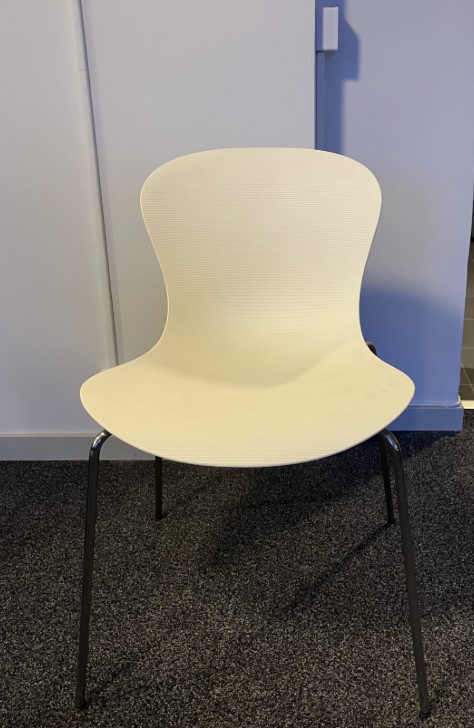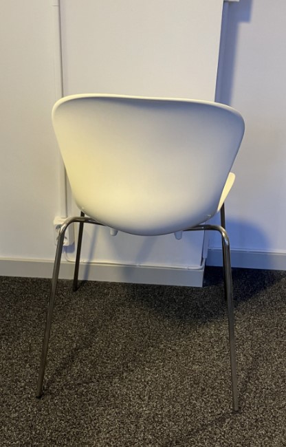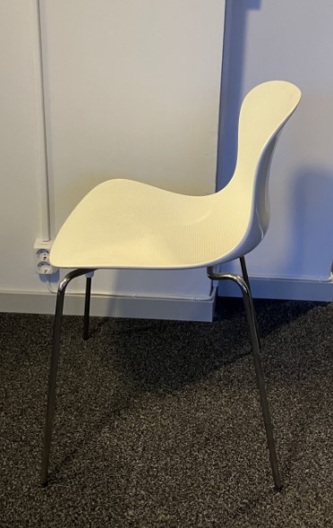 Sits och rygg i plast (vit). Ben i metall (krom).