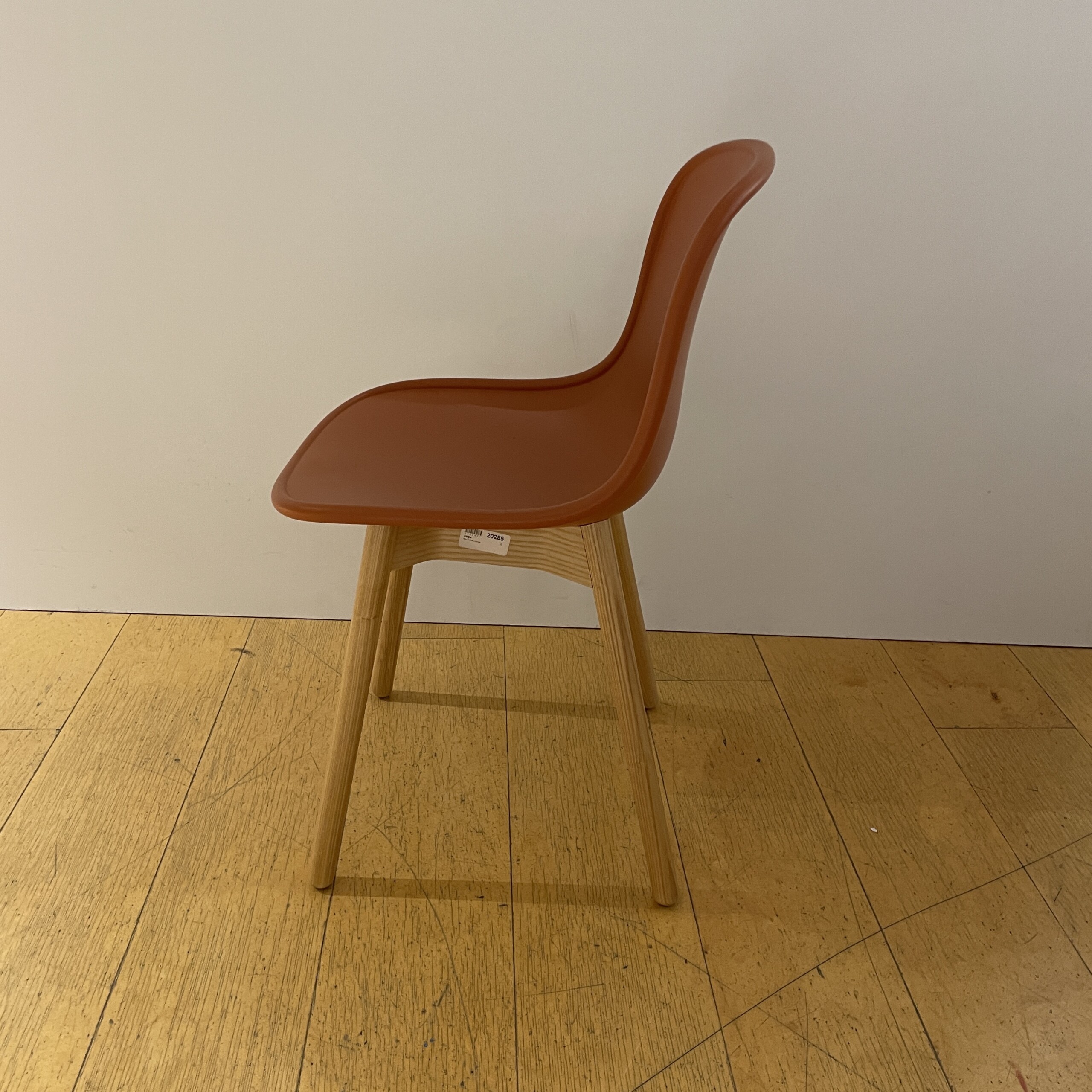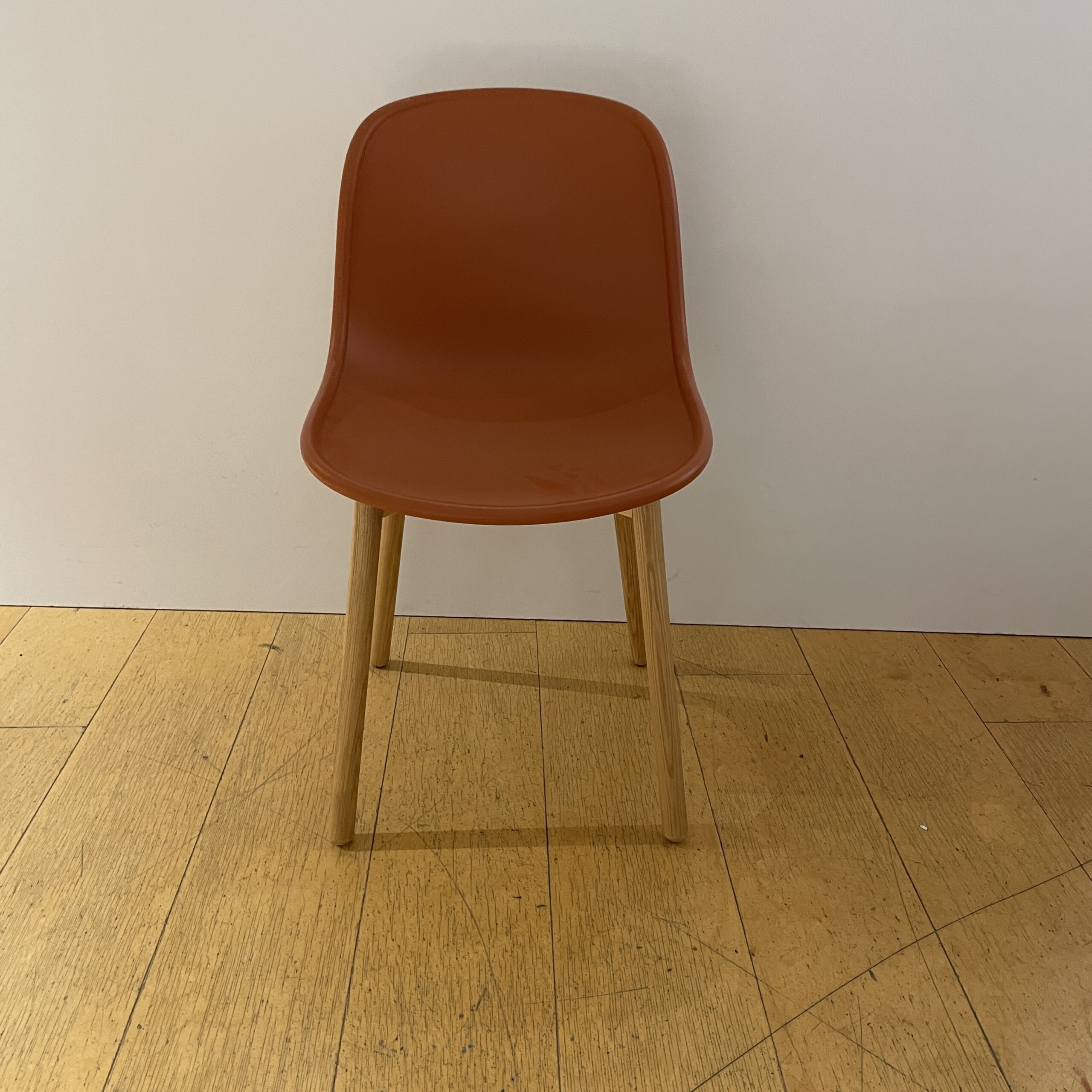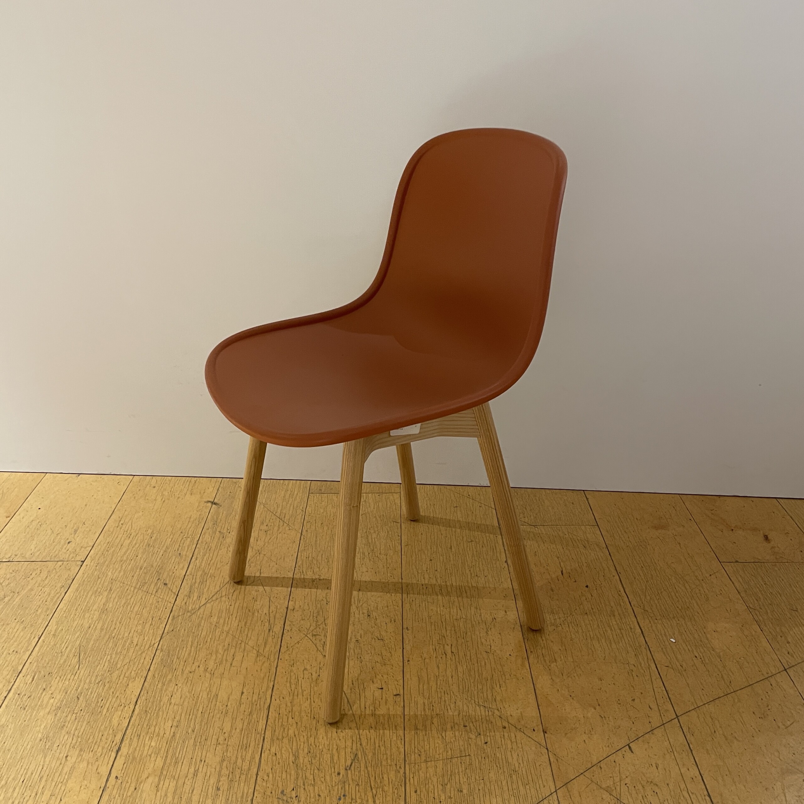 Sits och rygg i plast (orange). Ben i trä (ek).