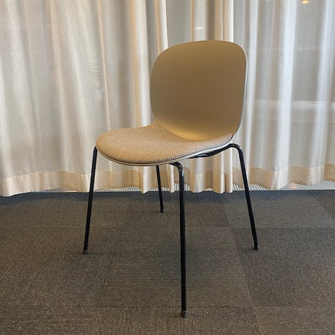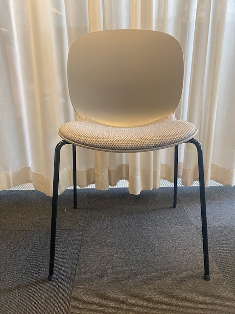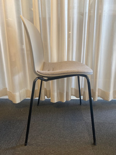 Sits i tyg (grå). Rygg i plast (grå). Ben i metall (svart).