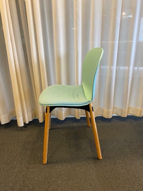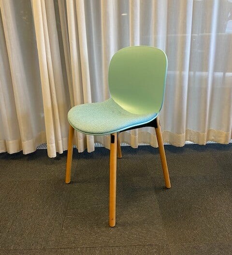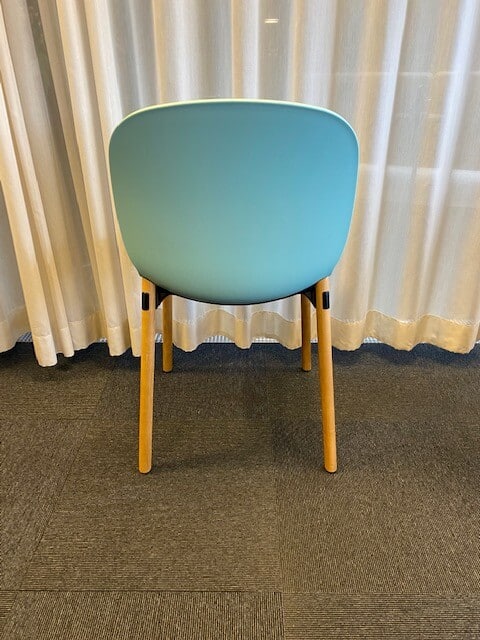 Sits i tyg (blå). Rygg i plast (blå). Ben i trä (ek).