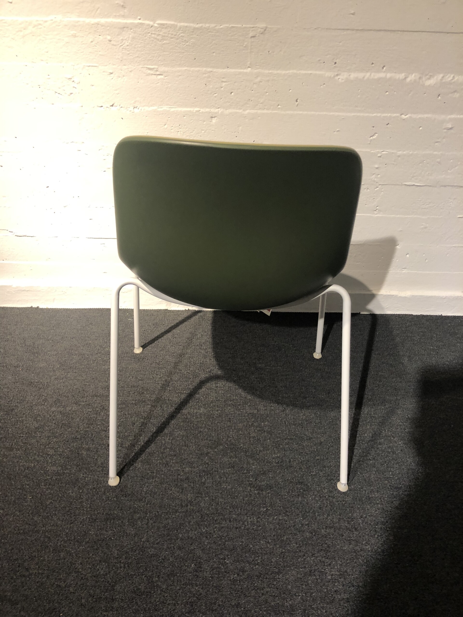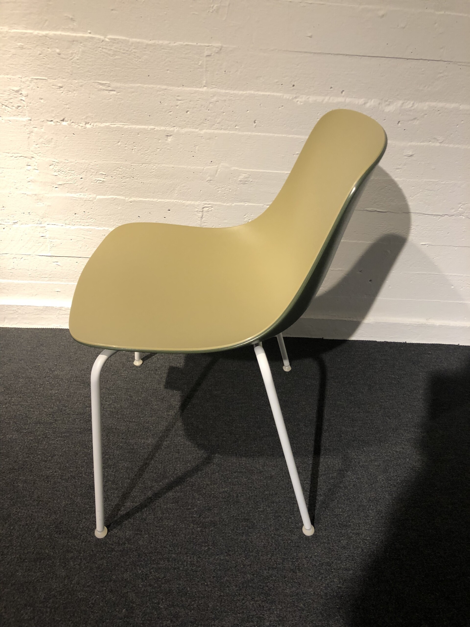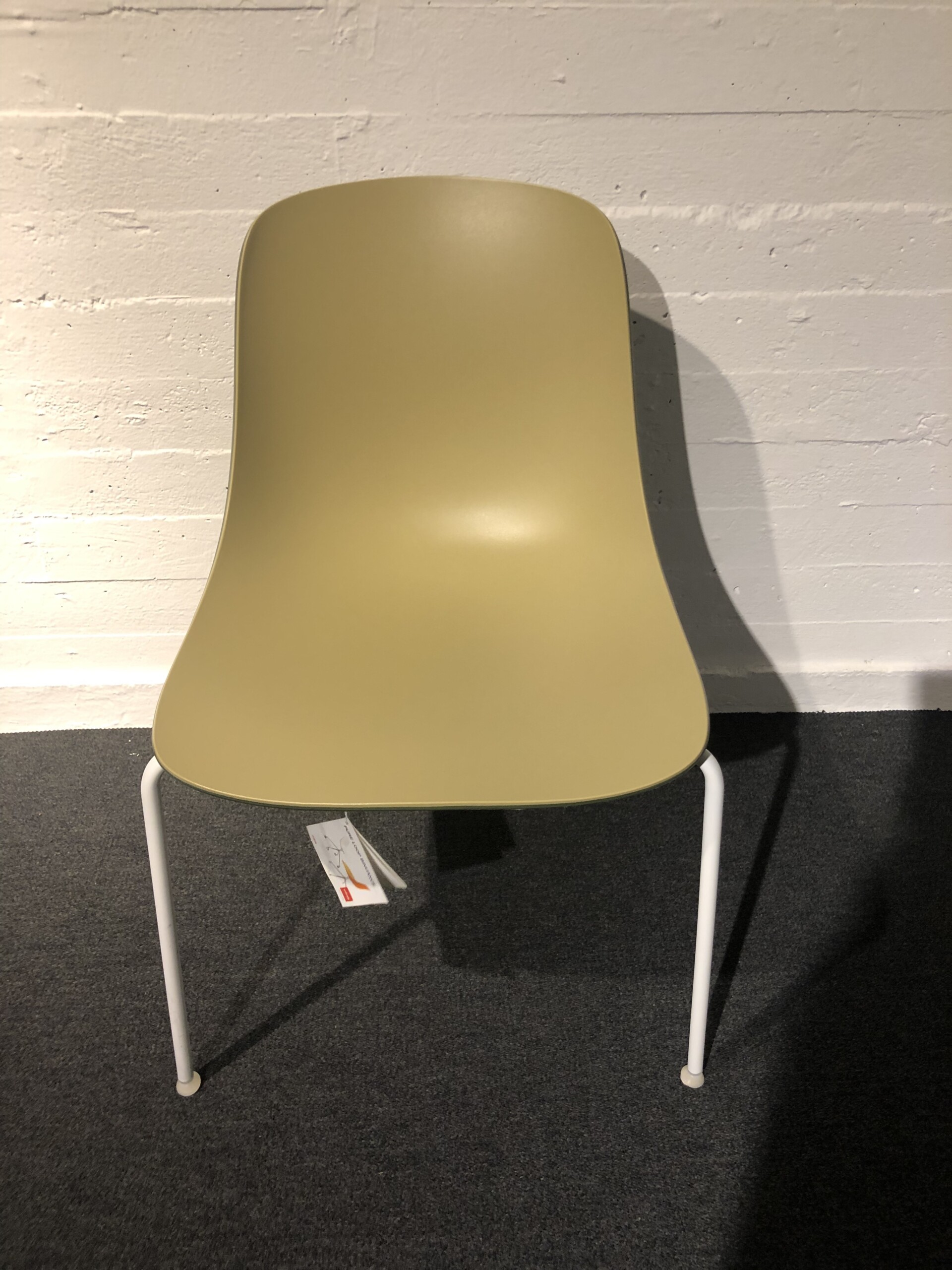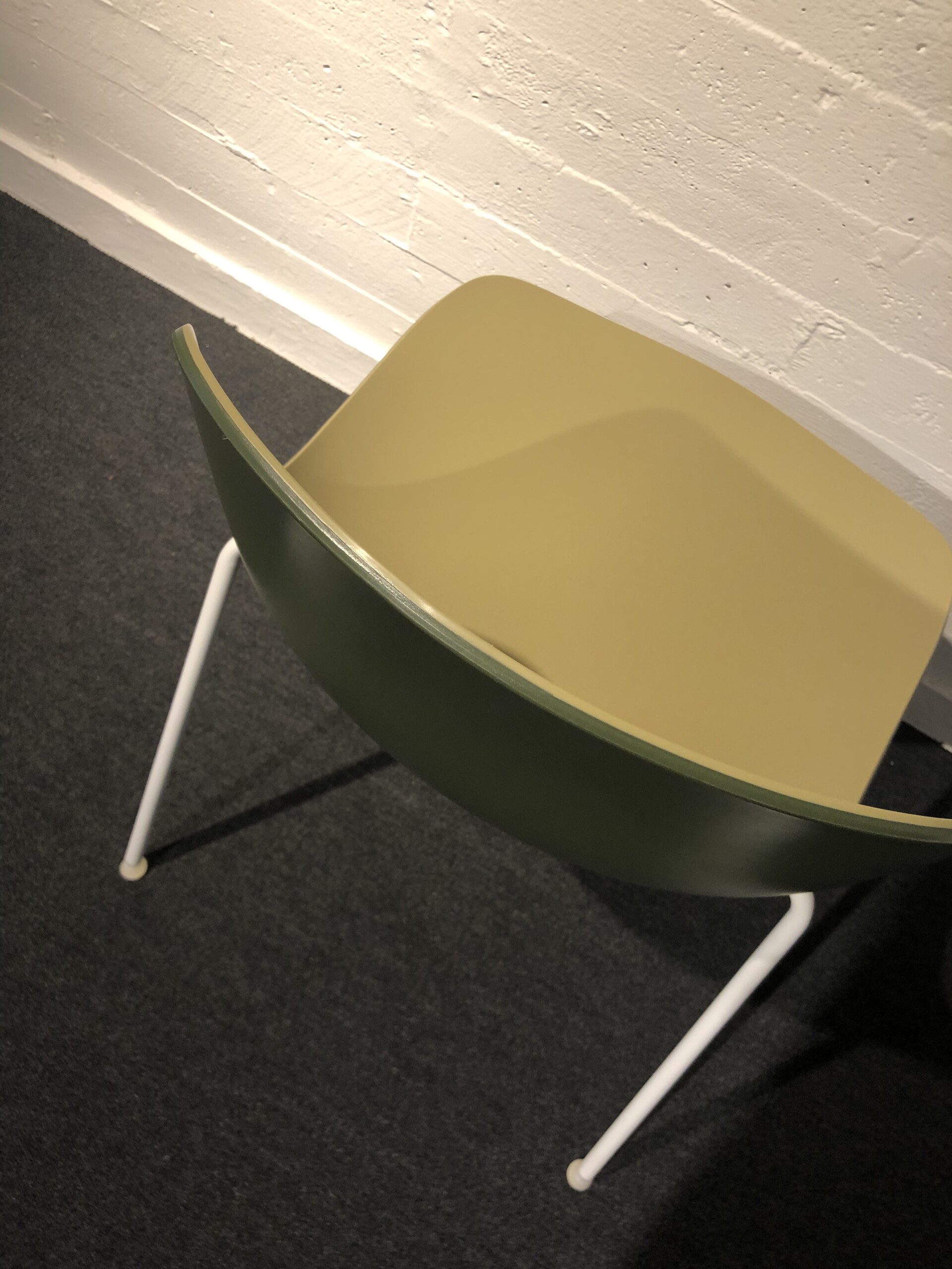 Sits i plast (gul). Rygg i plast (grön). Ben i metall (vit).