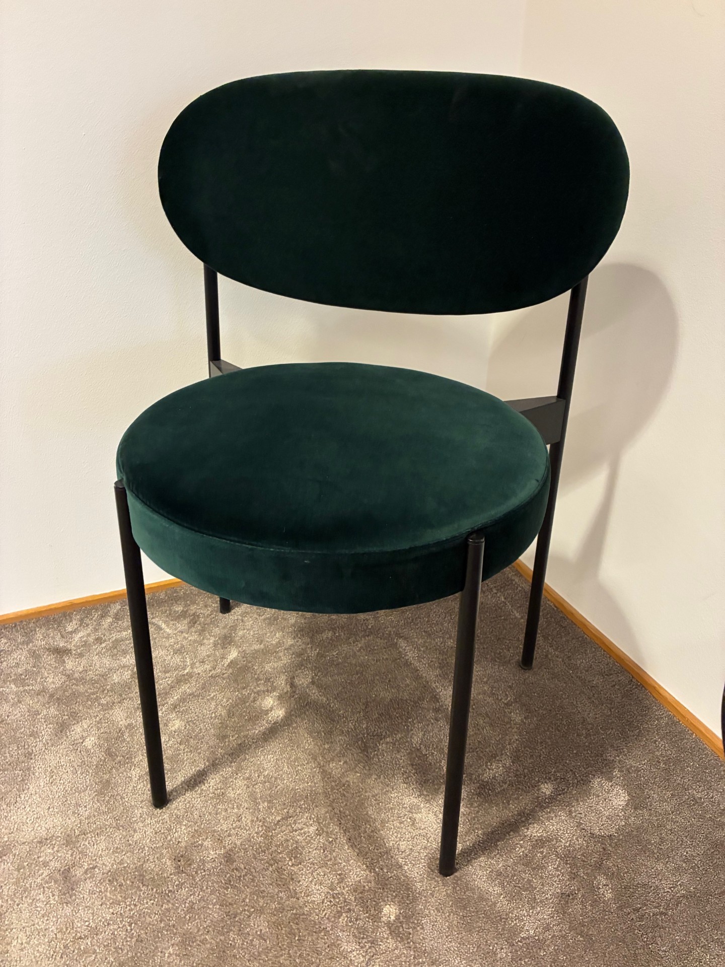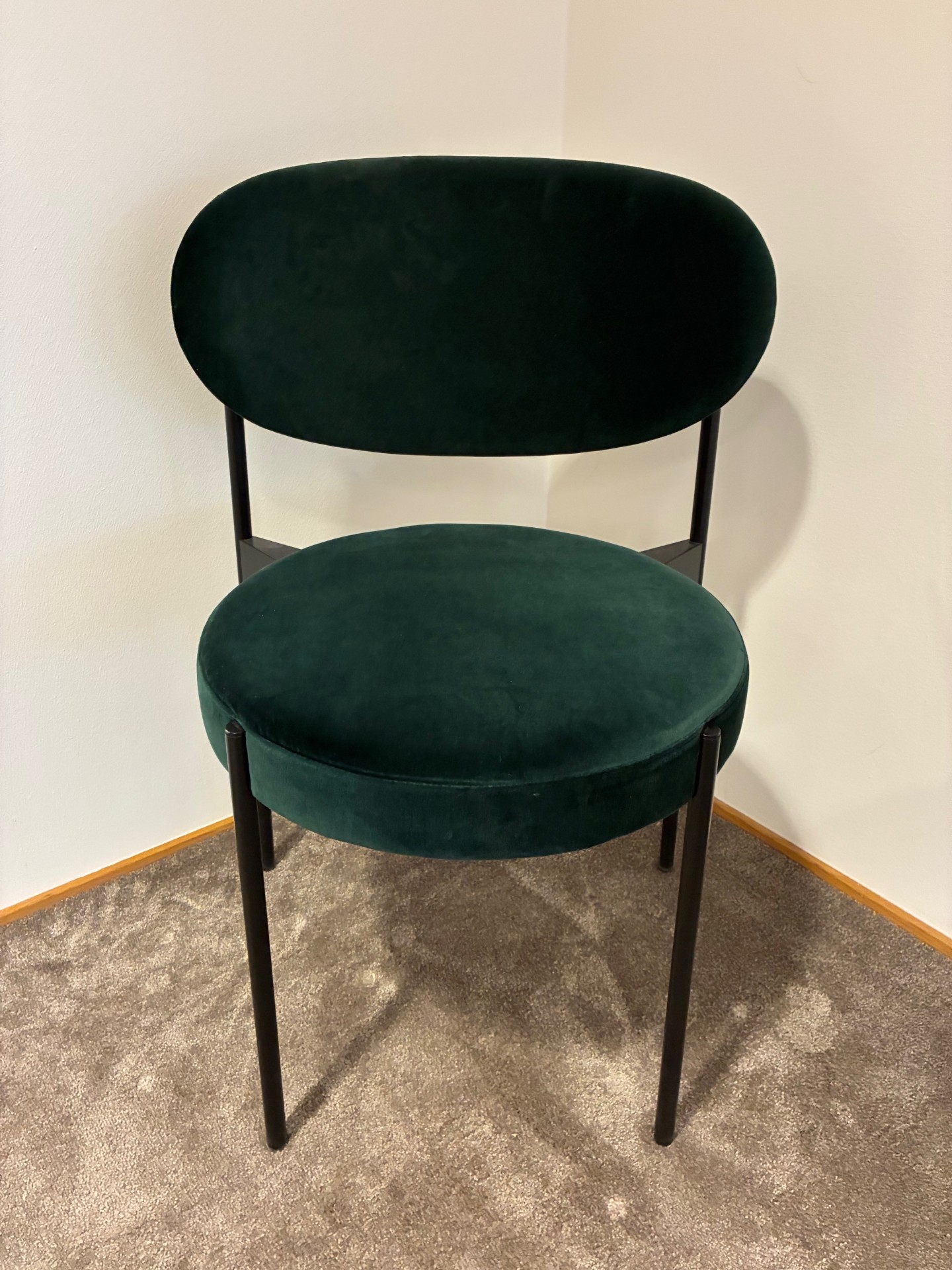Sits och rygg i tyg (grön). Ben i metall (svart).