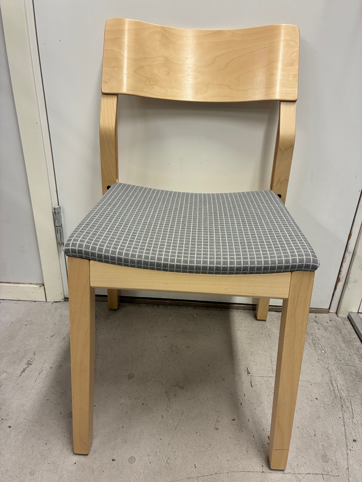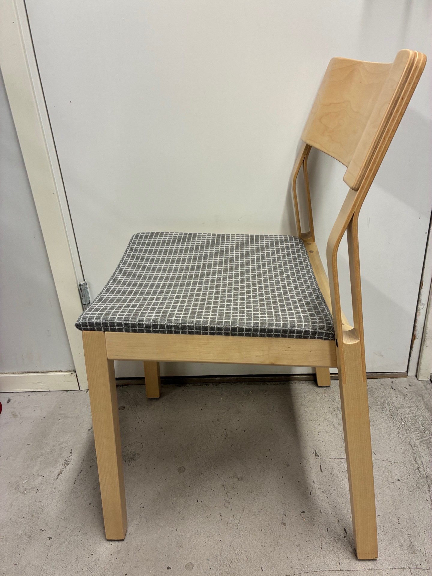 Sits i tyg (grå). Rygg i trä (björk). Ben i trä (björk).