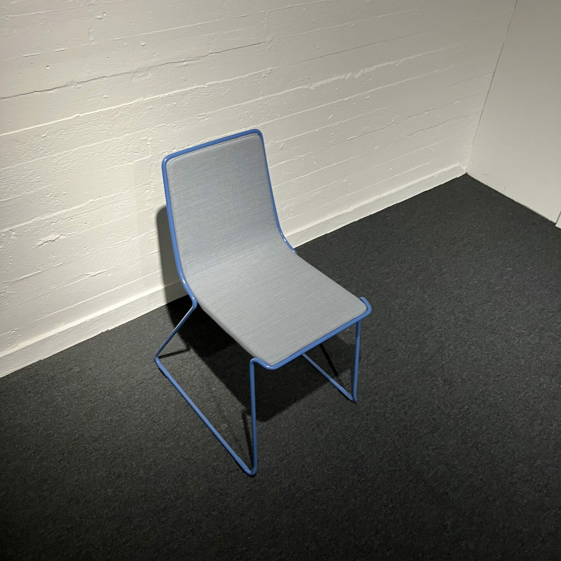 Sits och rygg i tyg (grå). Medstativ i metall (blå).