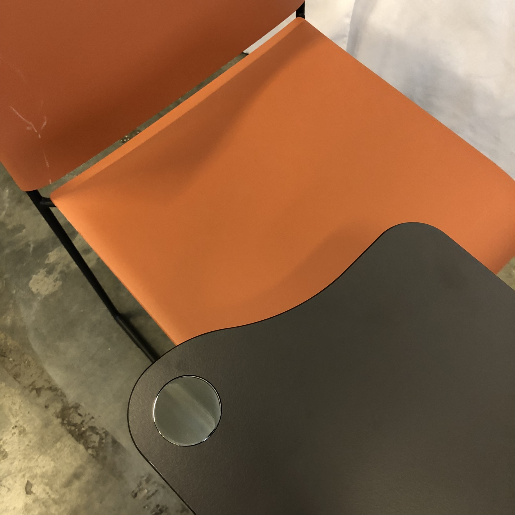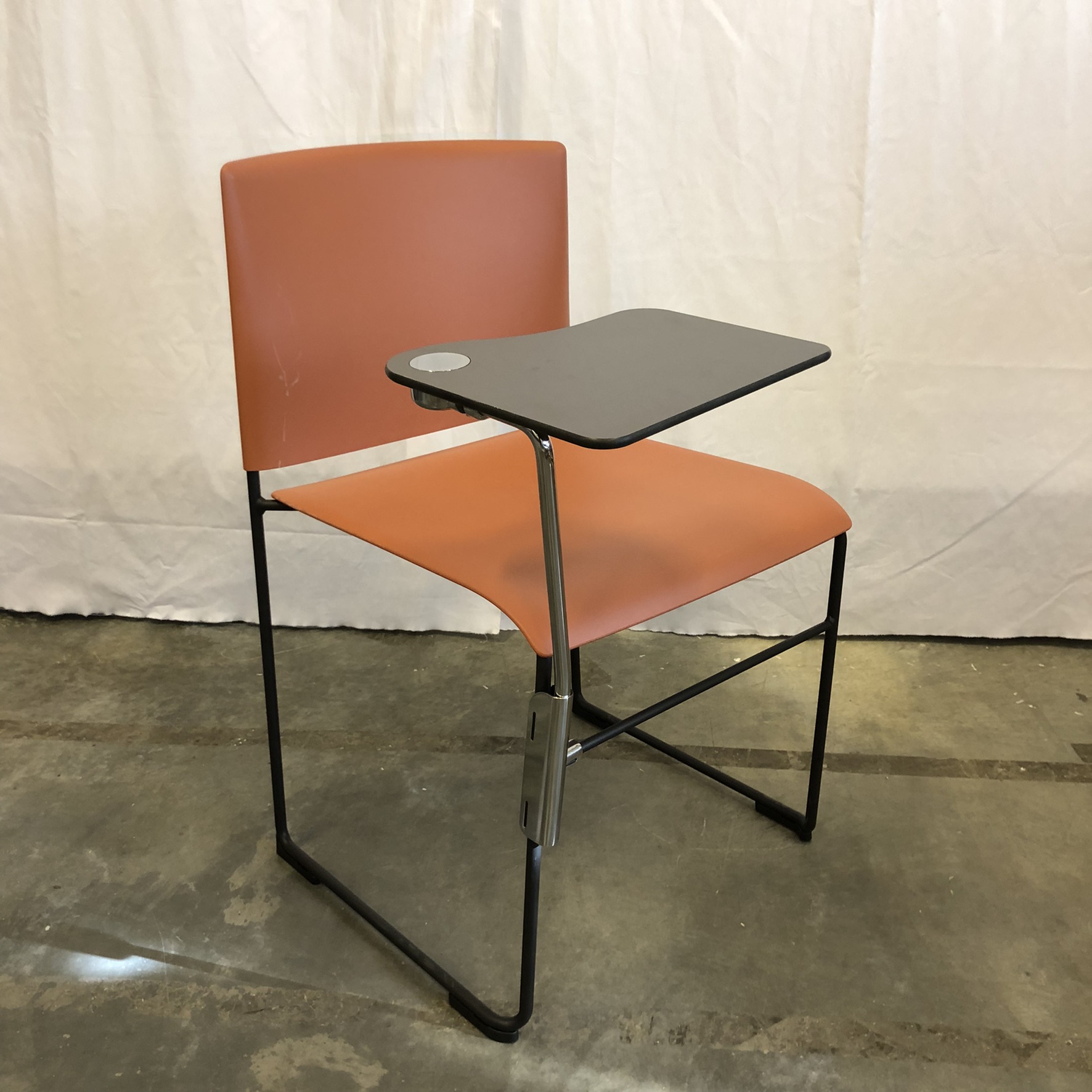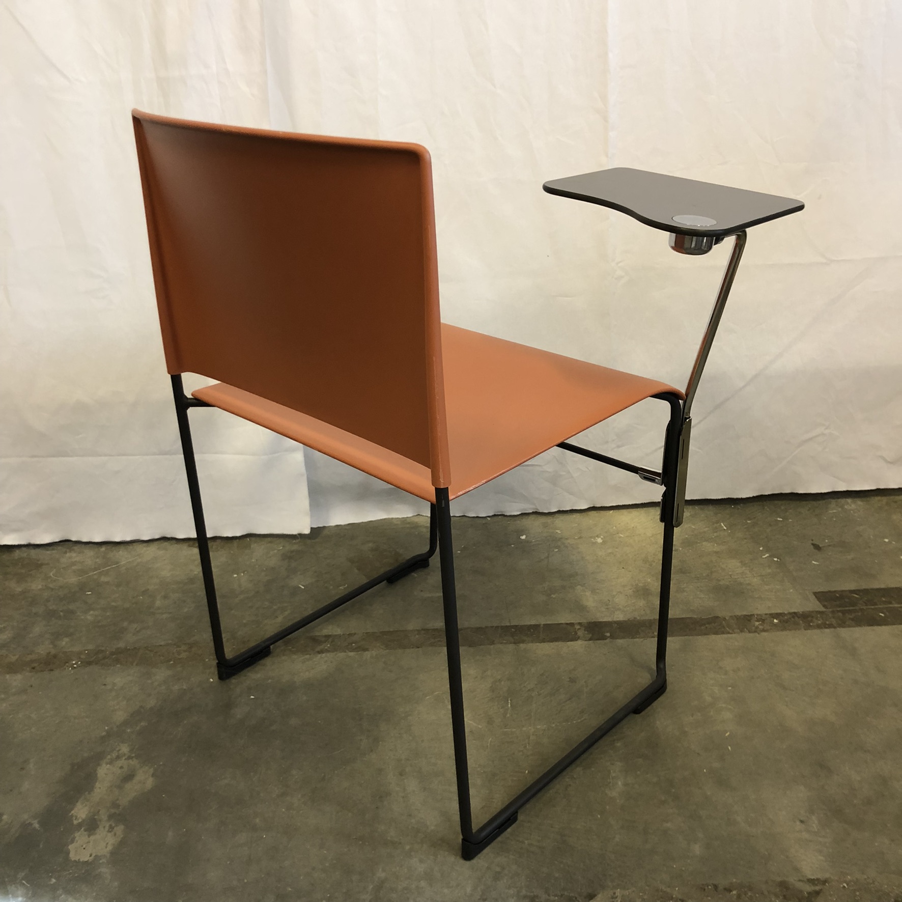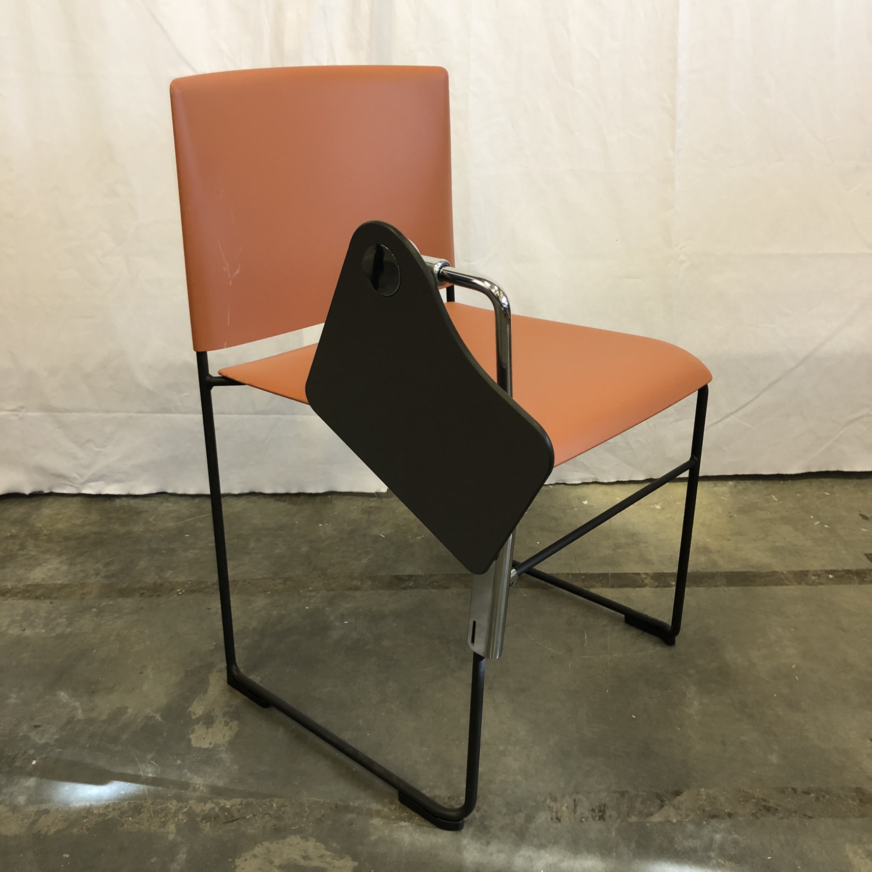 Sits och rygg i plast (orange). Medstativ i metall (svart).