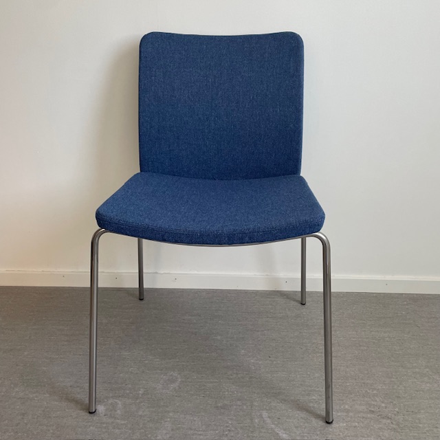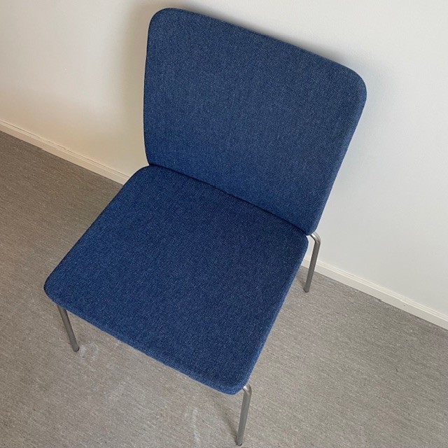 Sits och rygg i tyg (blå). Ben i metall (krom).