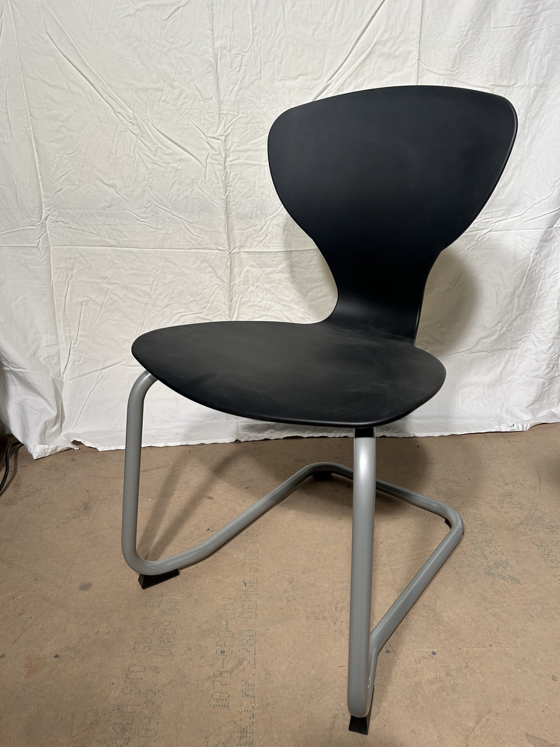 Sits och rygg i plast (svart). Medstativ i metall (silver).