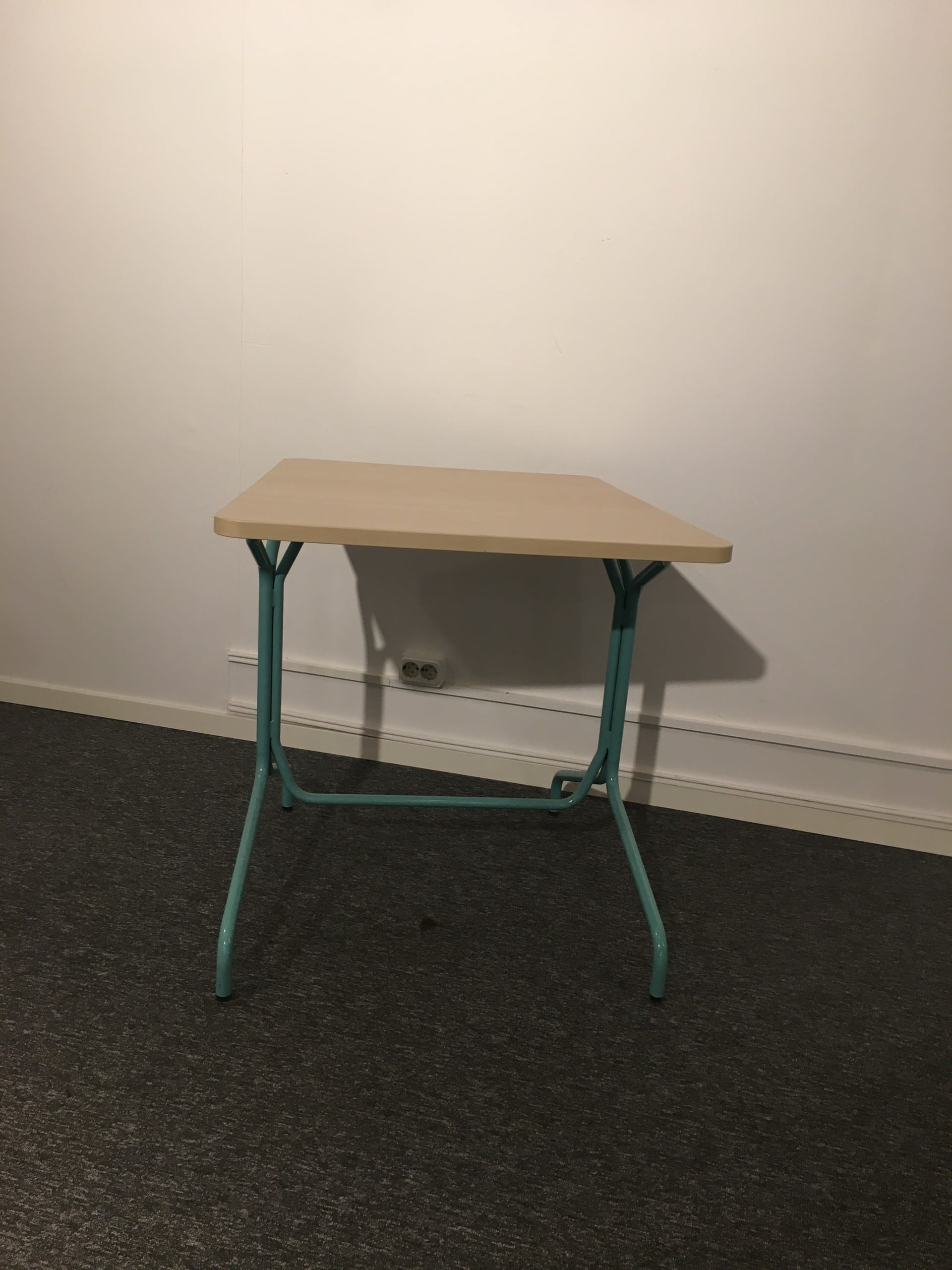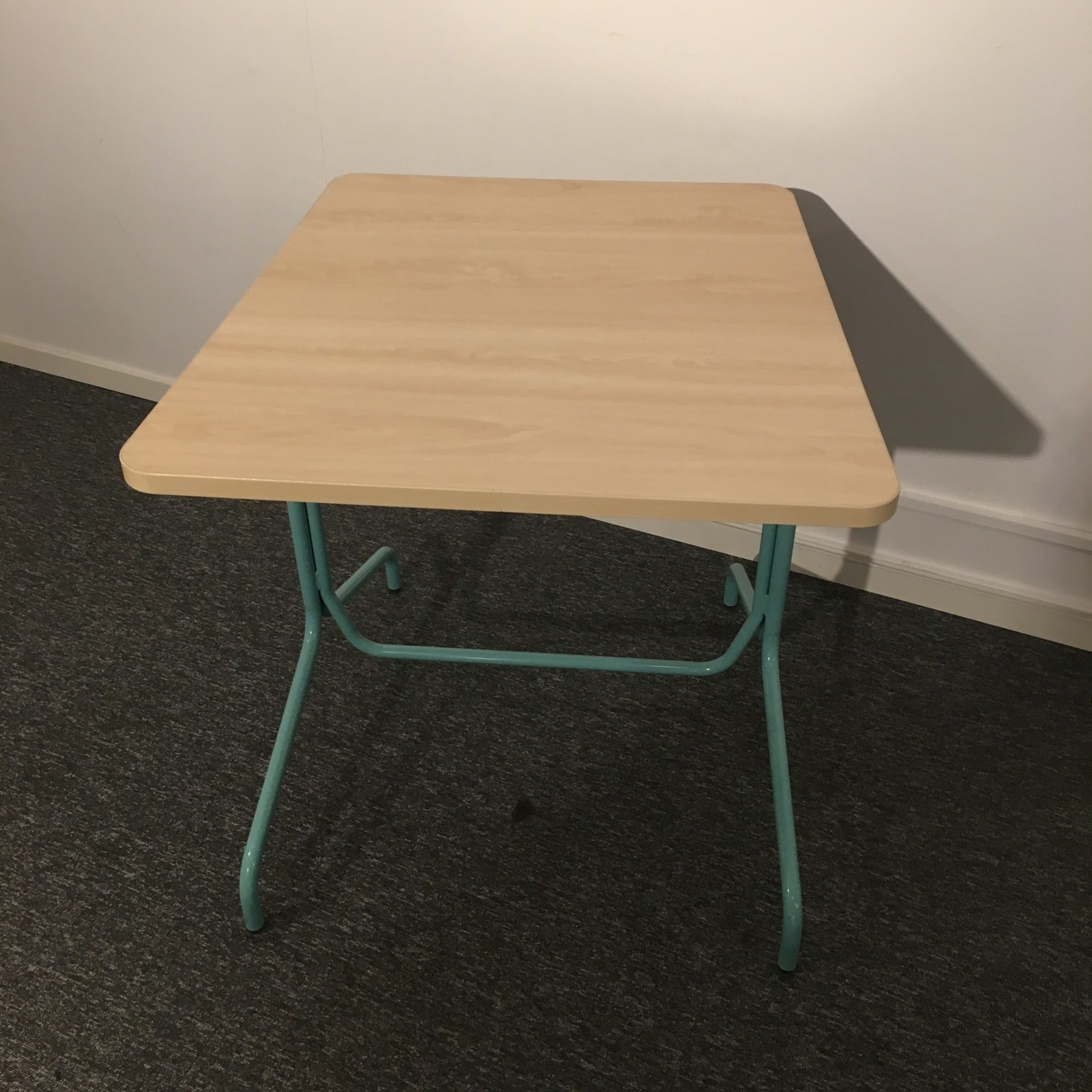 Bordsskiva i laminat (björk). Underrede i metall (turkos).