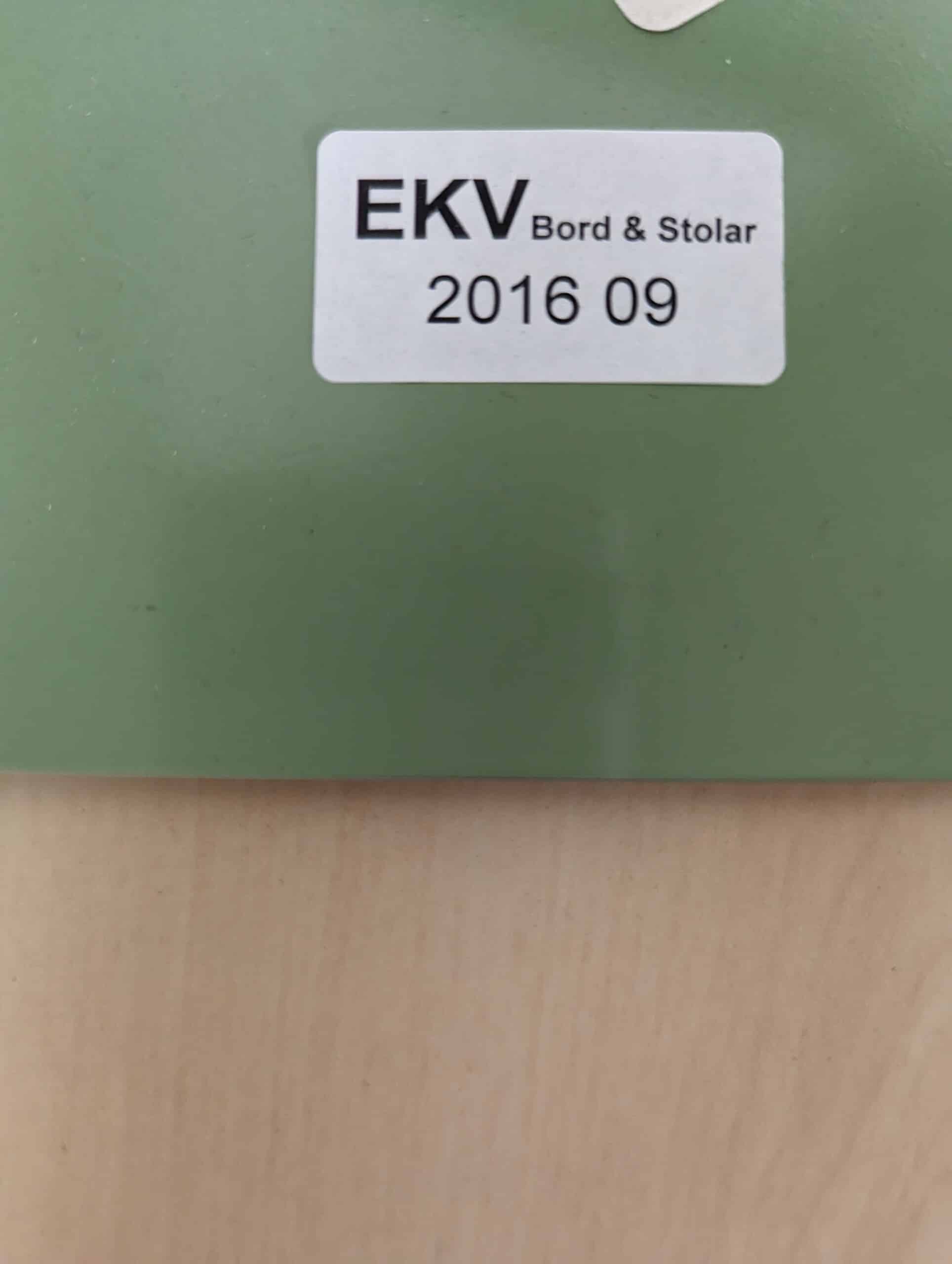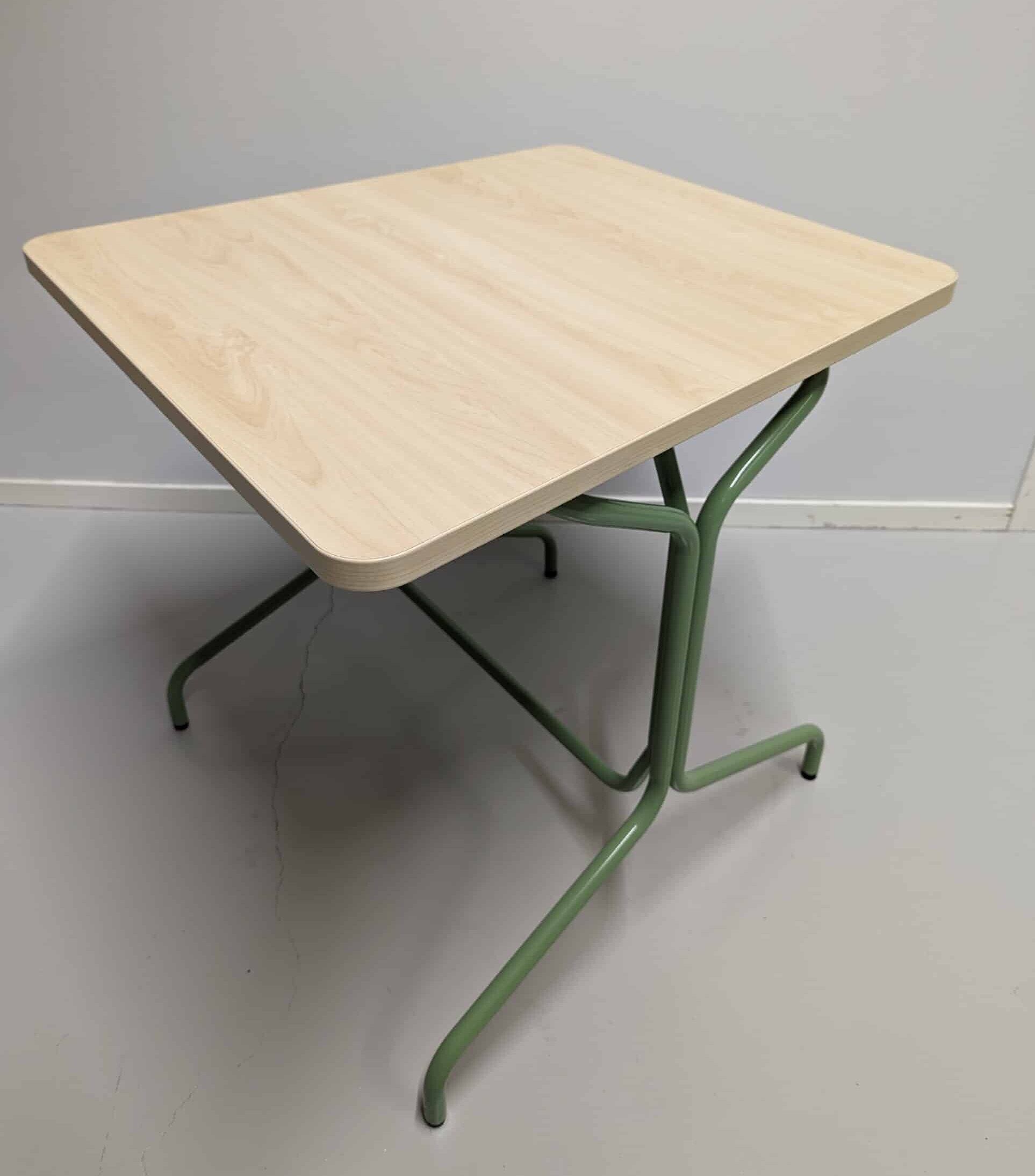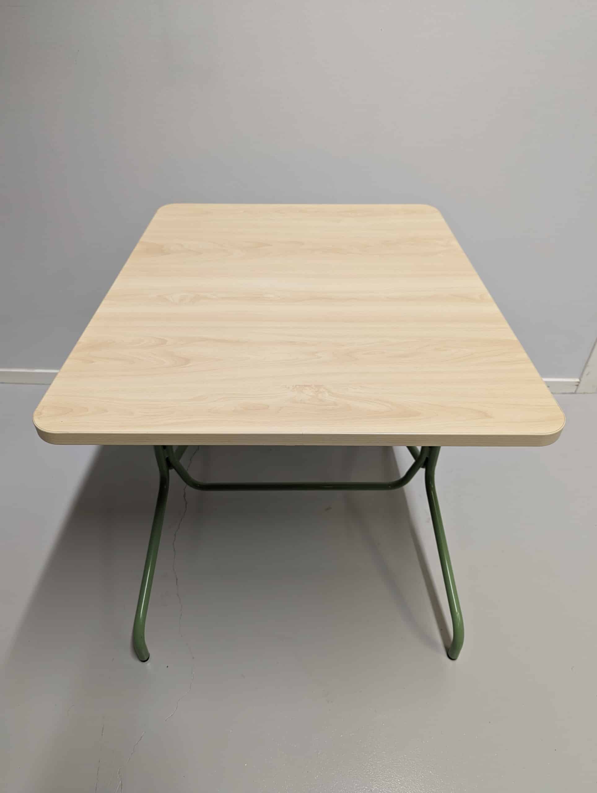 Bordsskiva i laminat (björk). Underrede i metall (grön).