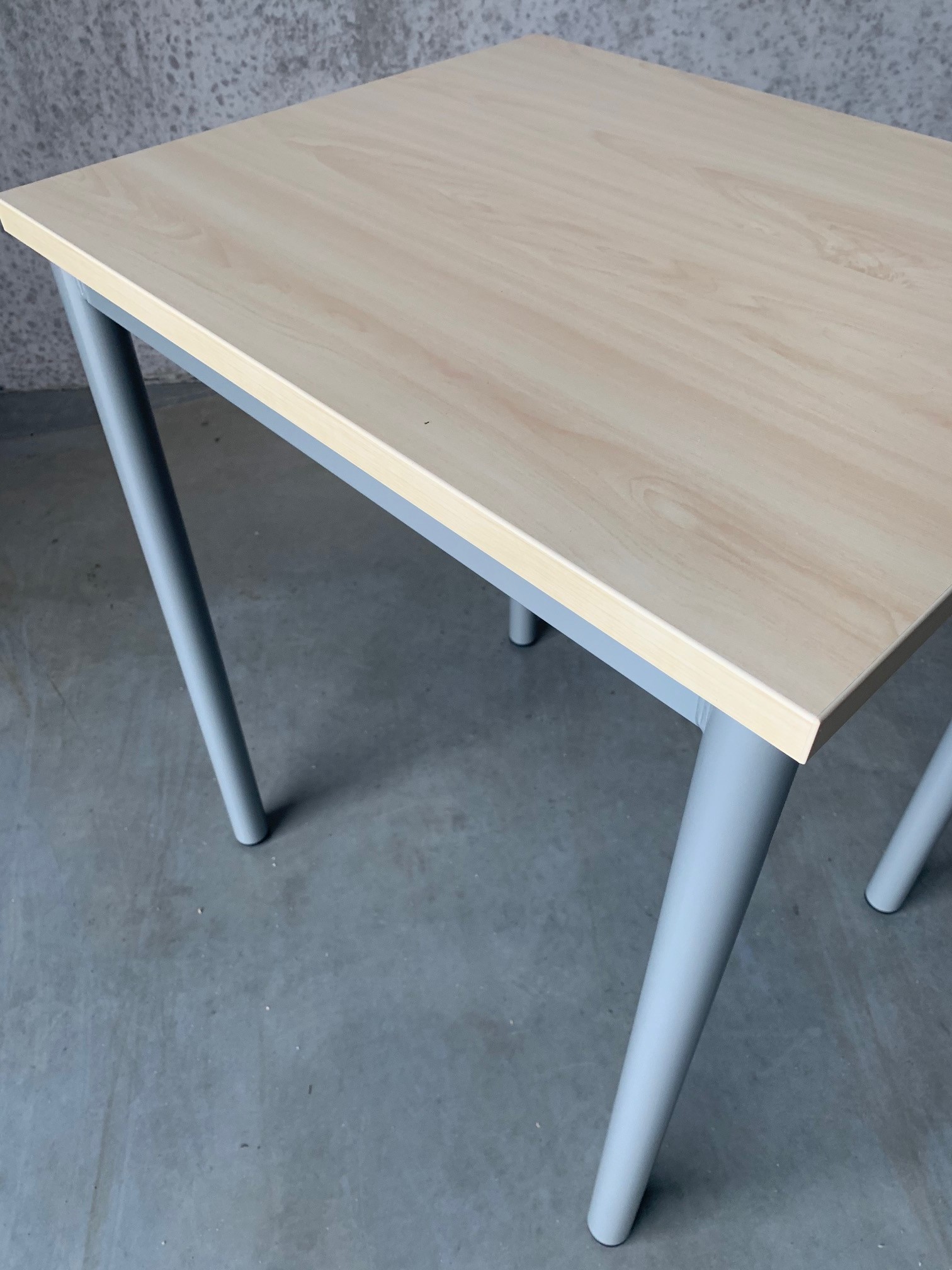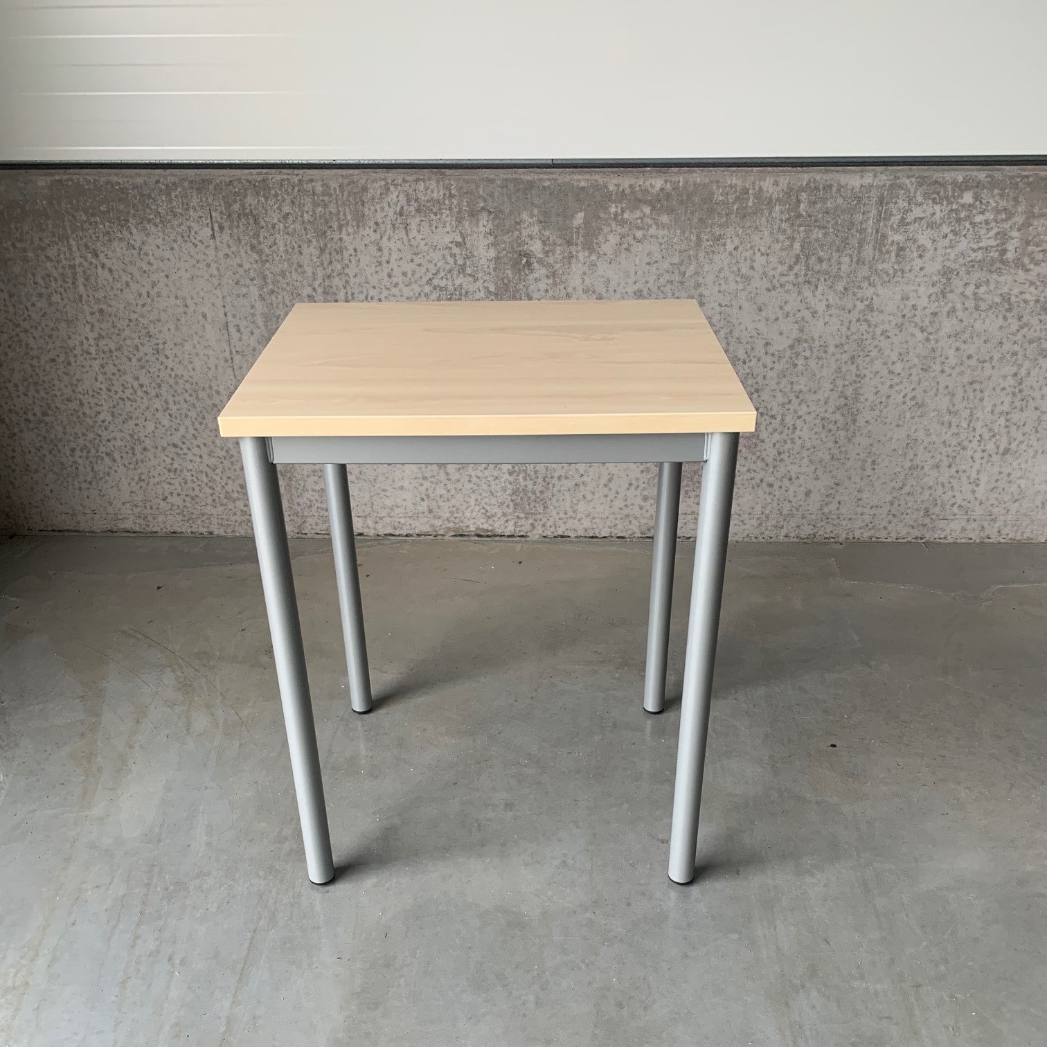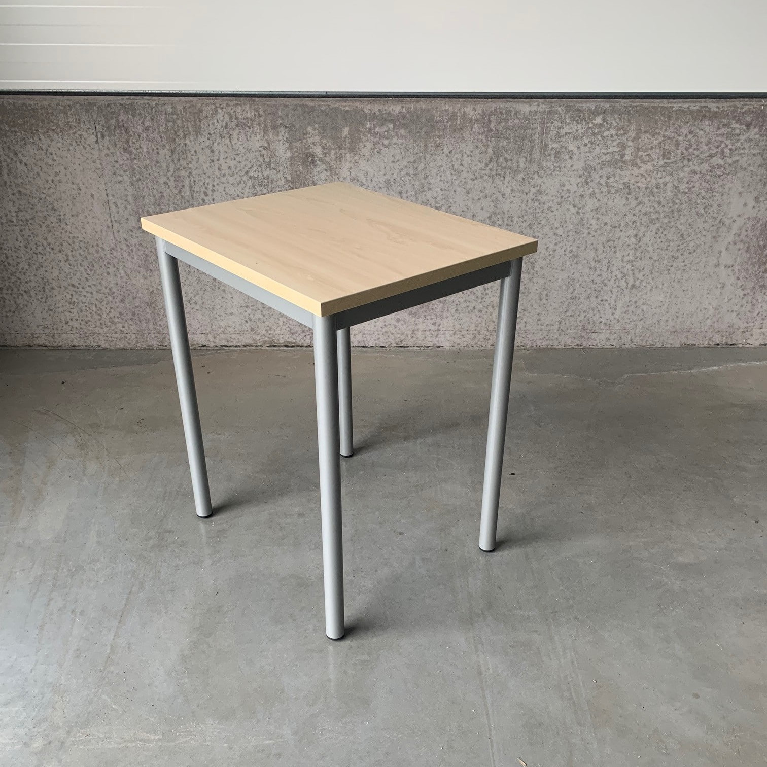 Bordsskiva i laminat (björk). Underrede i metall (silver).