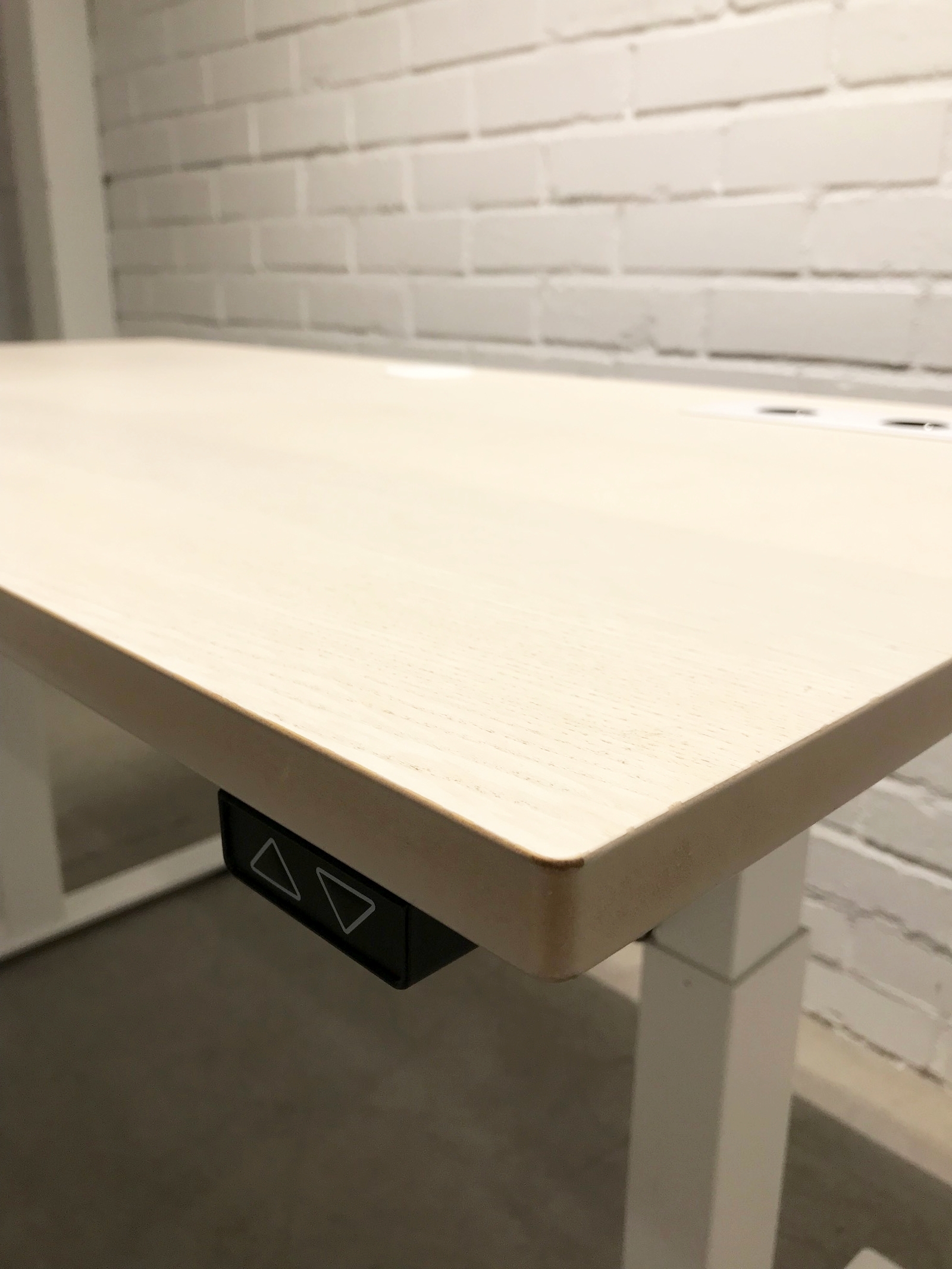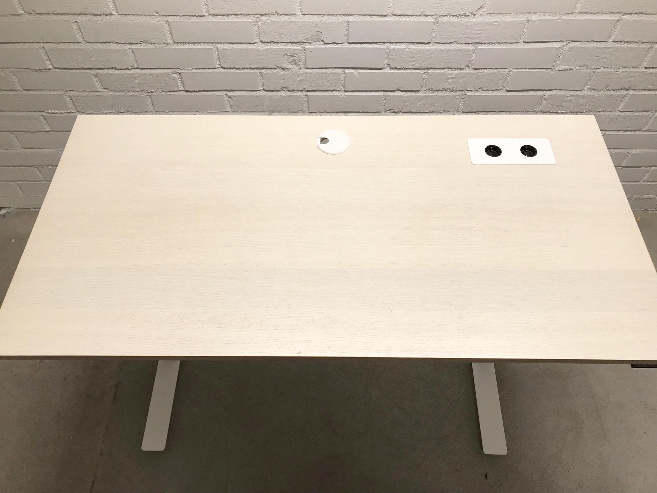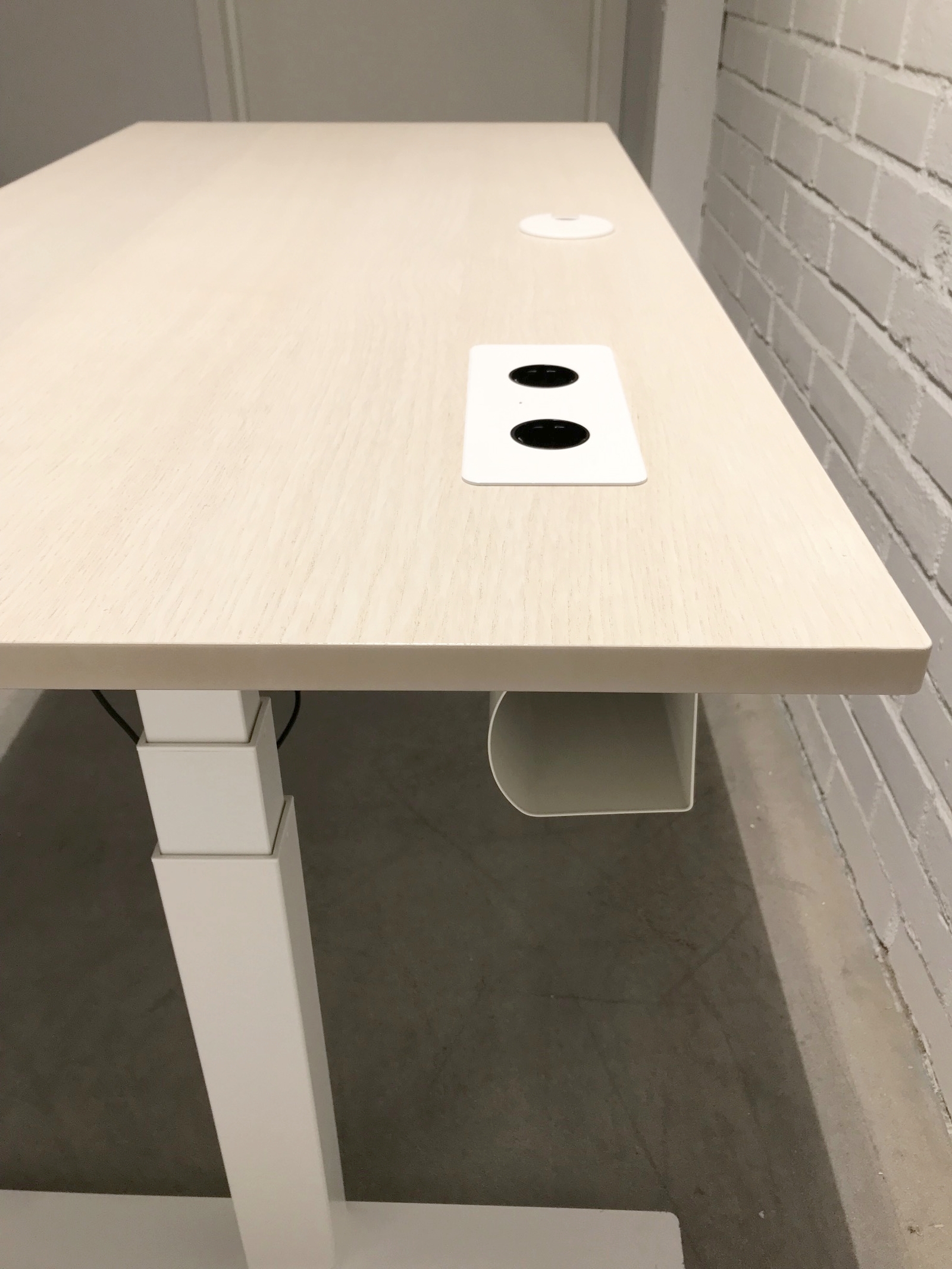 Bordsskiva i laminat (ask). Underrede i metall (vit). Höj- och sänkbart.