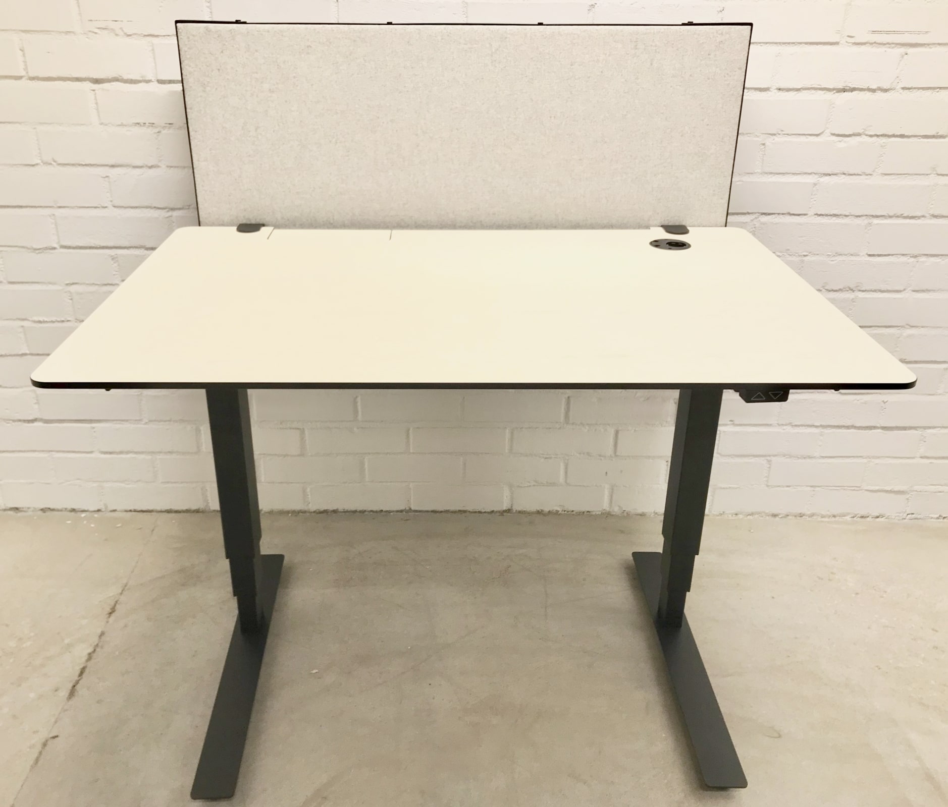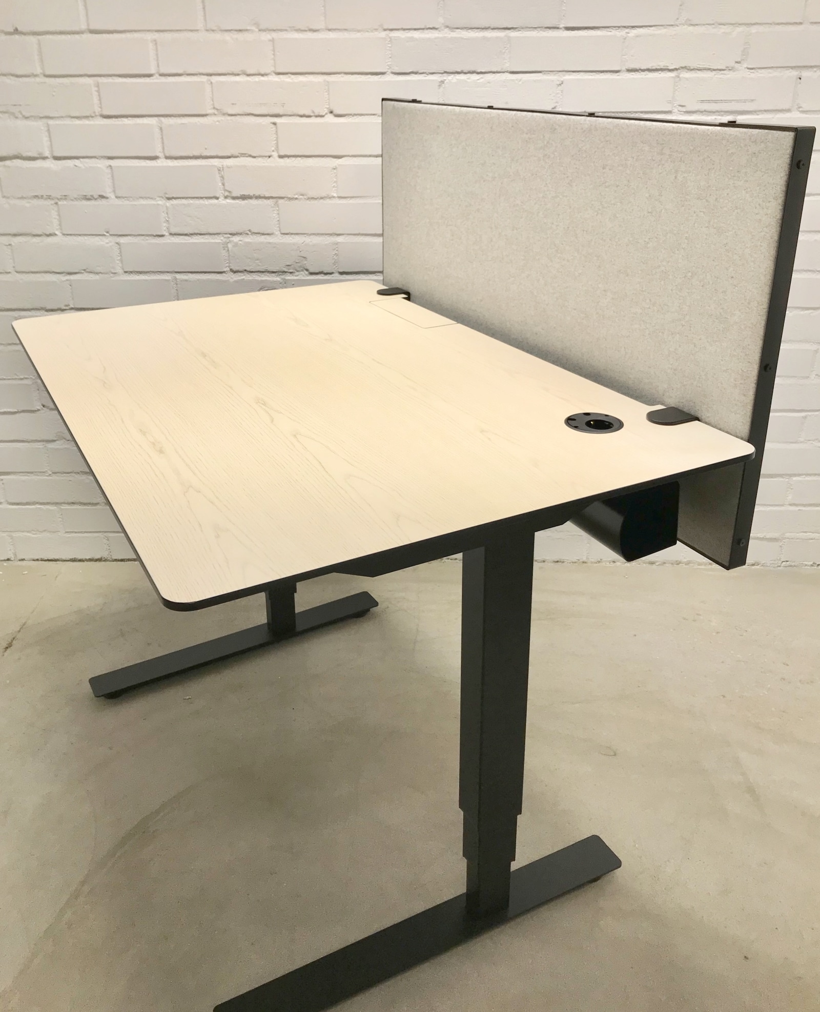 Bordsskiva i laminat (ask). Underrede i metall (svart). Höj- och sänkbart.